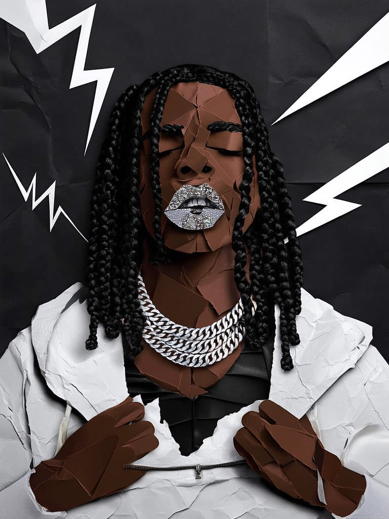 The young man's face and body are assembled from torn, mismatched paper fragments with dark brown and deep umber tones layered unevenly, his shoulder-length box braids formed from curled, twisted paper strips stacking irregularly. His arched brows and parted lips appear pasted on separately, one bottom lip piece cracked to reveal a fragmented diamond grill patch with sparkling collage elements. Both hands grip the torn white hoodie collar, composed of jagged paper edges with folded creases, while the layered silver Cuban chains gleam with distorted metallic paper highlights. His skin texture is rough and matte, broken into pieces revealing subtle layered shadow patches and pasted razor bump textures around the neckline.