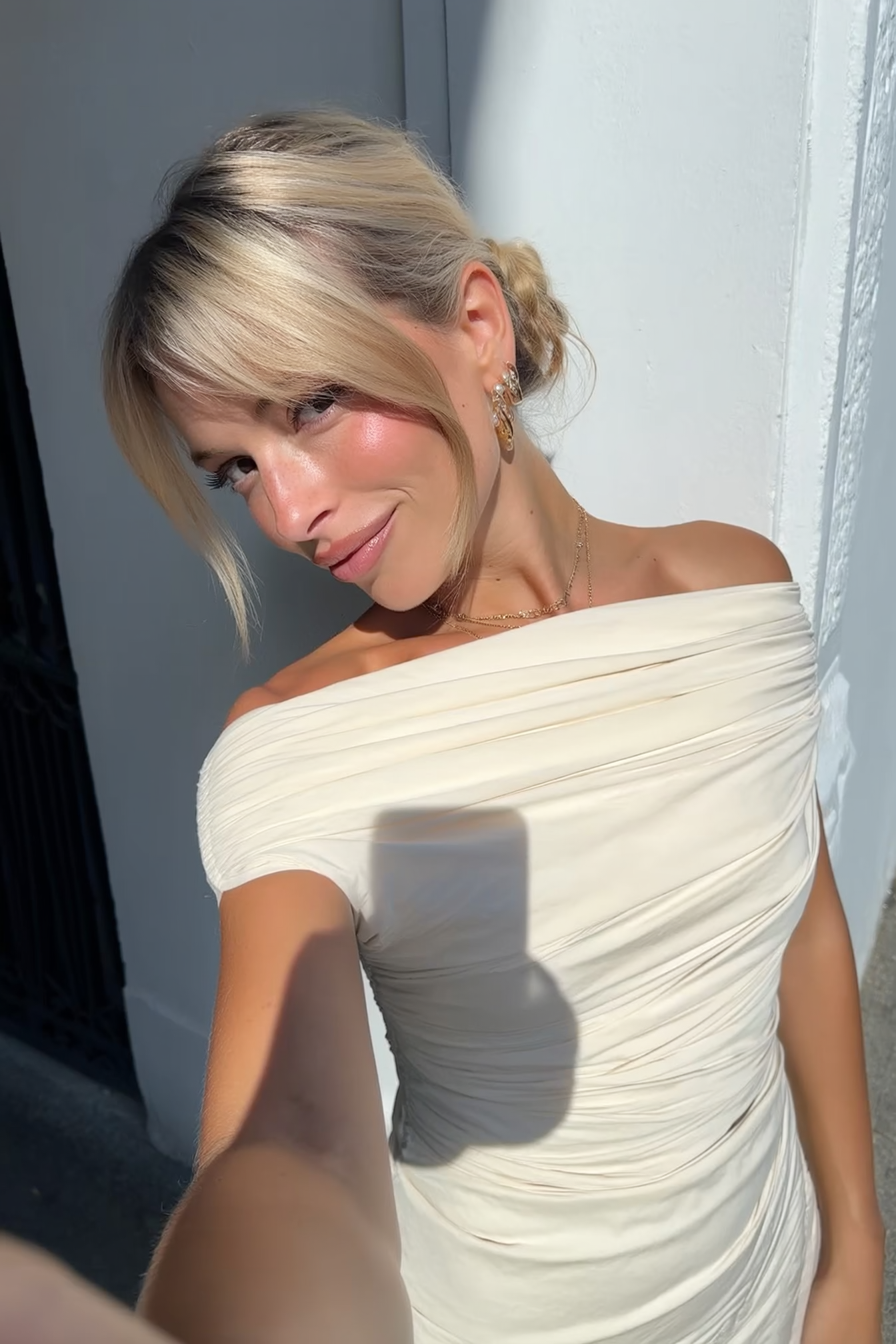 A spontaneous, playful iPhone selfie captures a blonde woman with a minimalist bun and gelled sideburns, wearing an original sculptural off-shoulder ivory top inspired indirectly by contemporary social media fashion aesthetics. She looks softly and naturally into the camera with a gentle, slightly tilted head, her clean and glowy makeup featuring nude lips and faint blush adding subtle elegance. She stands before a pure white urban wall rendered with realistic texture and urban detail. Bright natural sunlight casts authentic soft shadows enhancing skin glow and fabric texture, emphasizing the creases and structured fabric of her top. The composition highlights a distinctly exaggerated wide-angle distortion and elevated overhead angle typical of casual handheld iPhone selfies, enlarging her expressive upper body and head while slightly diminishing the lower body. Fine details include realistic hair strands, subtle skin texture, natural fabric wrinkles, and an overtly casual, authentically spontaneous social media selfie aesthetic conveying stylish personal expression and playful engagement with the camera.