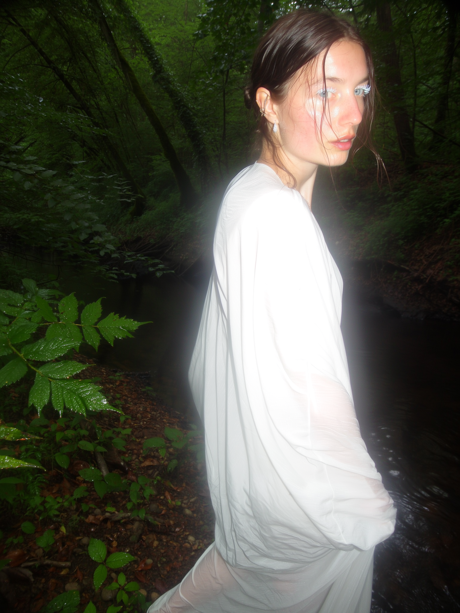A pale-skinned woman clad in a softly flowing white dress emits a gentle, radiant white glow that softly diffuses around her figure as she stands naturally and uncontrived beside a shadowy dark green forest riverbank. Her icy blue eyes and white lashes subtly catch the muted overcast daylight filtering through dense, damp foliage overhead. Her skin shows delicate textures of natural warmth and pores, slightly flushed by the cool, humid forest air, while stray wisps of hair fall casually around her face, catching faint glimmers of light. The deep green leaves around her shimmer subtly with moisture, enveloped by a thin, ethereal white fog that drifts through the scene. The sheer white fabric of her cloak wrinkles gently at the folds, emphasizing tangible texture. The image is captured from a casual, slightly angled iPhone perspective, heightened by soft focus, light haze, and the characteristic warm, diffuse shadows typical of spontaneous forest shade photography.