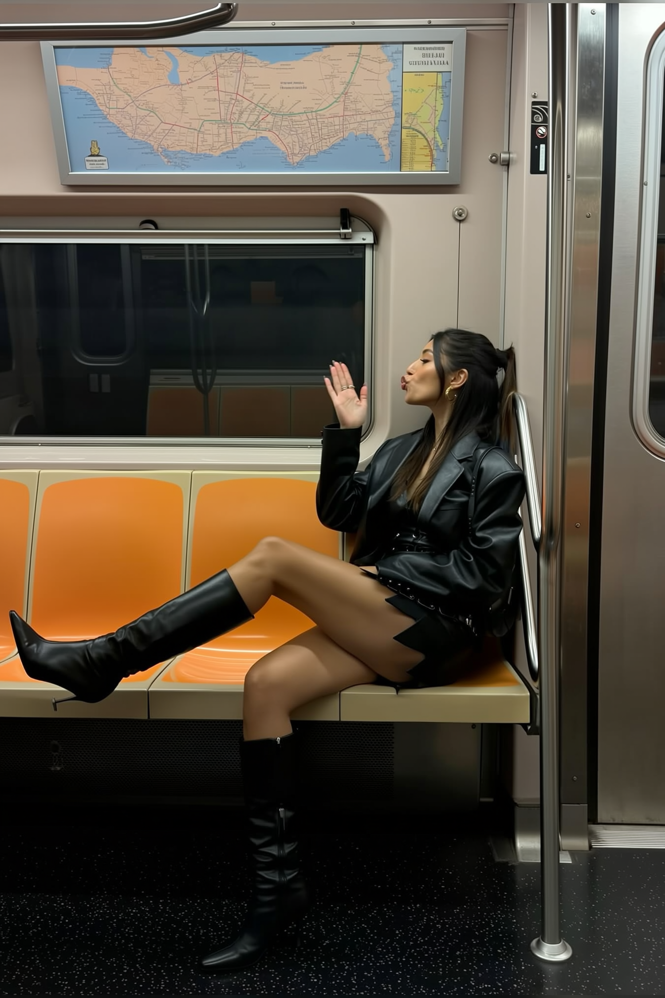A stylish woman seated sideways on a muted warm orange subway seat, legs crossed elegantly, wearing a fitted black leather jacket, a trendy mini skirt, and tall black boots. She casually blows a kiss with a relaxed, natural expression. The scene captures an edgy metropolitan vibe with soft, diffused subway lighting gently illuminating her features. The subway car door is visible subtly at the right edge of the frame, and above her head a framed subway map is clearly displayed. The dark subway tunnel is reflected in the window behind her, adding depth and atmosphere to this intimate urban moment.