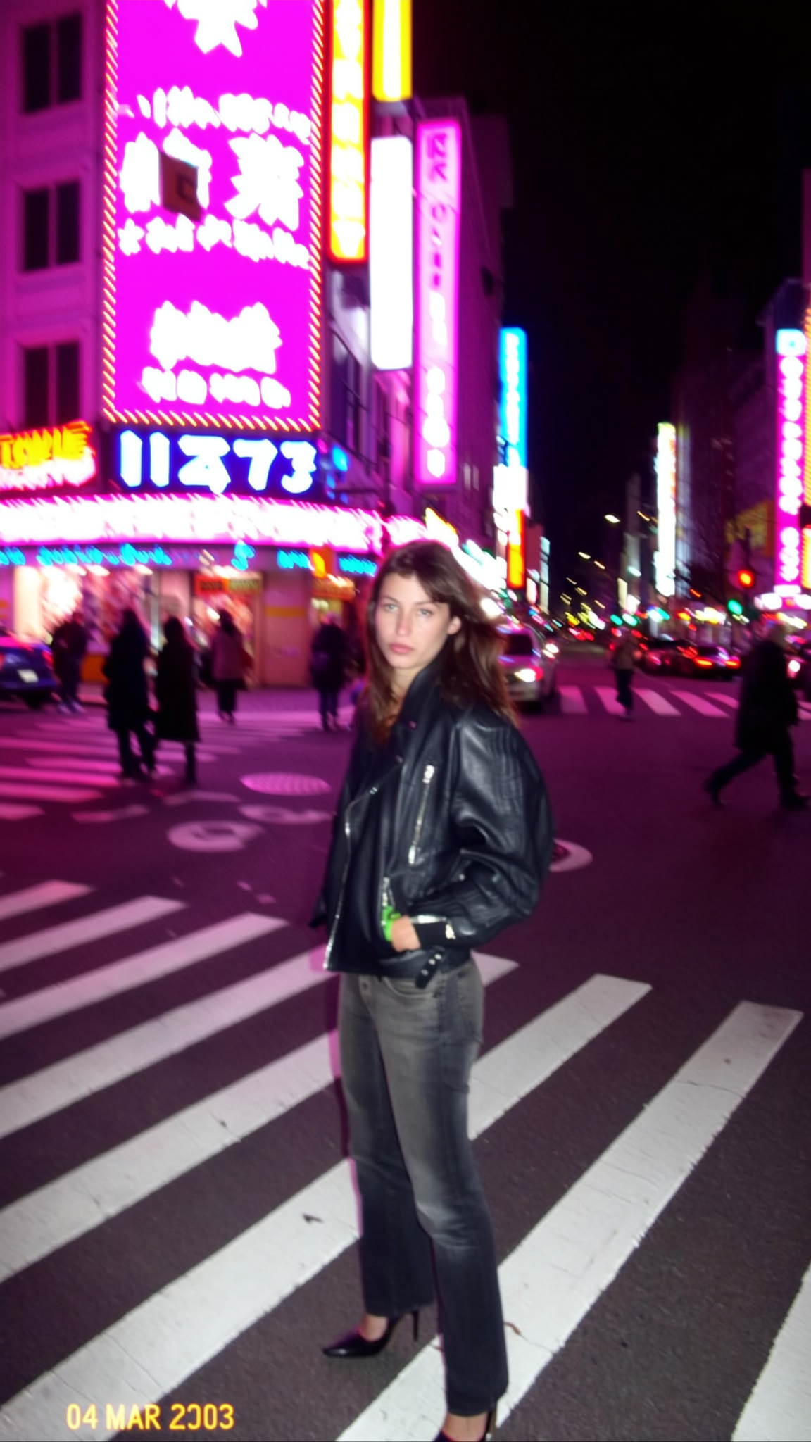 A sudden pop from the built-in flash cuts through the dim city street as a woman in a leather jacket and heels stands stiff at the pedestrian crossing, neon shop signs swirling behind her in a blur of pastel pink and blue glows. The CCD sensor struggles in the low light, speckling the shadows with grain and pixel fringing while the soft focus edges smear the glow into a hazy haze. The camera's shaky Dutch tilt adds to the restless tension in the frame, a jagged timestamp reading “04 MAR 2003 23:18” stamped in the corner next to a flickering battery icon. She blinks against the flash; the low-res capture feels like a stolen fragment from a late-night wander. The photo quality suggests a slightly grainy or low-resolution digital look, capturing a candid moment.—early-2000s digicam snapshot, grainy low-res quality