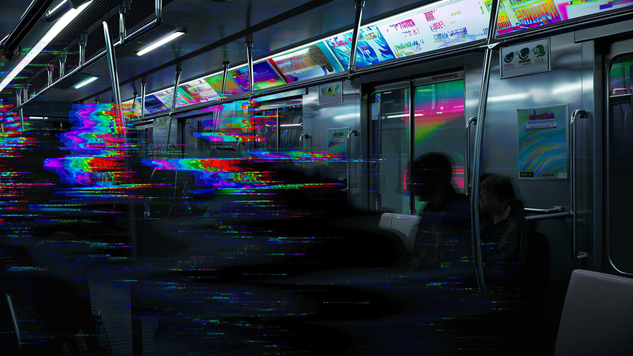 Inside a futuristic subway car, dim ambient light flickers across sleek metallic surfaces as commuters' dark, shadowy silhouettes blur and lag, fragmented by intermittent horizontal scan-line distortions that slice through their forms like corrupted frames of a malfunctioning broadcast. The walls are adorned with holographic advertisements marred by rainbow banding and pixelated artifacts, their text twisted and indecipherable, cascading down in glitch cascades of multicolored digital noise and RGB chromatic aberrations reminiscent of corrupted analog signals. The composition focuses tightly on a cluster of figures seated and standing, their bodies partially melting into the shifting digital decay, evoking a deep sense of isolation amid the noisy chaos. Subtle moiré patterns ripple across window reflections, blending with granular static textures that hint at an aging CRT monitor. The overall color scheme melds cold neon blues, magentas, and electric cyans with a stark metallic backdrop, suffused by flickering shadows that enhance the unsettling tension between human vulnerability and unstable technological environments. The atmosphere exudes cyberpunk alienation, a surreal urban nightmare caught between reality and corrupted data streams, rendered in a fractured, glitch-surrealist visual narrative.