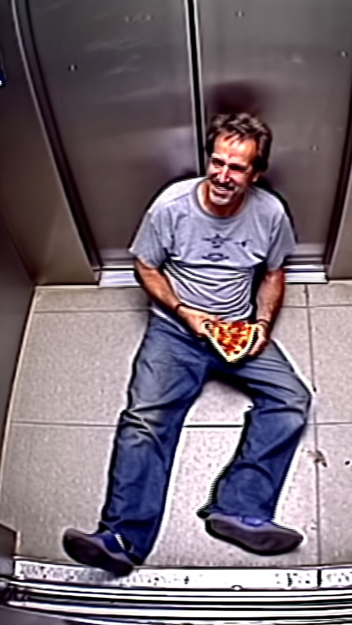 A grainy, blurred top-down CCTV-style shot of a middle-aged man sitting casually on the tiled floor of an elevator, holding a slice of pizza. He wears a slightly wrinkled gray t-shirt and loose jeans, his hair unkempt and tousled, with a faint smile reflecting relaxed contentment. The elevator floor features subtle scuffs, faint dirt marks, and reflective metal borders visible beneath his feet. The scene is illuminated by flat, even fluorescent overhead lighting casting minimal shadows, characteristic of security camera footage. Pronounced grain, compression artifacts, and moderate blur soften details like fabric texture and skin imperfections, consistent with surveillance video quality. The framing is a medium, slightly off-center high-angle shot capturing the man centrally with the simple elevator floor and walls framing the image, reinforcing the utilitarian and observational style typical of CCTV video.