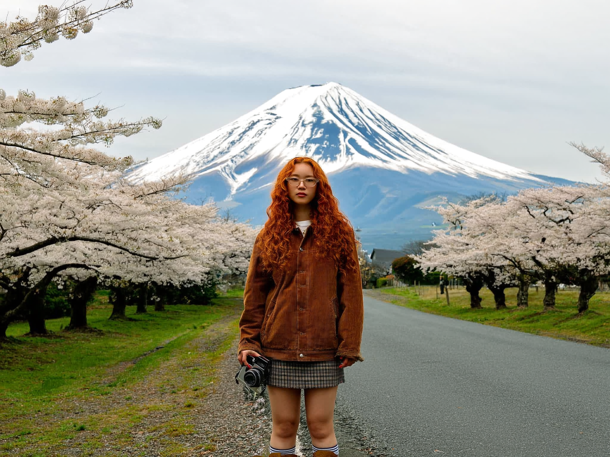 A high-resolution editorial-style photograph capturing a young woman with long curly red hair and translucent glasses standing on the edge of a quiet country road lined with blooming sakura trees. She wears a brown corduroy jacket with natural fabric wrinkles, a plaid miniskirt, and mismatched socks peeking out from sturdy boots, showcasing layered textures and casual streetwear. In her relaxed right hand, she holds a vintage film camera by her side. Her face is softly angled slightly upward, eyes meeting the camera lens with a calm and focused expression. Behind her, Mount Fuji occupies the center background, glowing white-blue under soft, diffused overcast light that gently illuminates her and the surroundings. The composition is a long frame to include the sakura-lined road leading towards Mount Fuji, ensuring the mountain's majestic presence balances the portrait naturally and stylishly, evoking a thoughtful, serene moment in early spring.