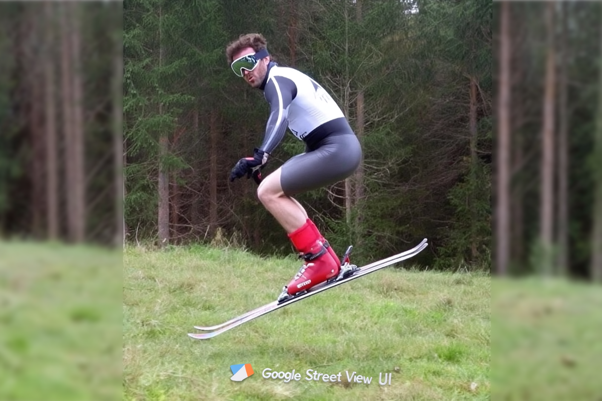 A man in ski gear is caught mid-air on grassy terrain, jumping on skis in front of a forested backdrop. He’s wearing goggles and leaning forward as if totally unaware of the absurdity. The Google Street View UI is visible at the bottom, anchoring the randomness of the shot in total realism.