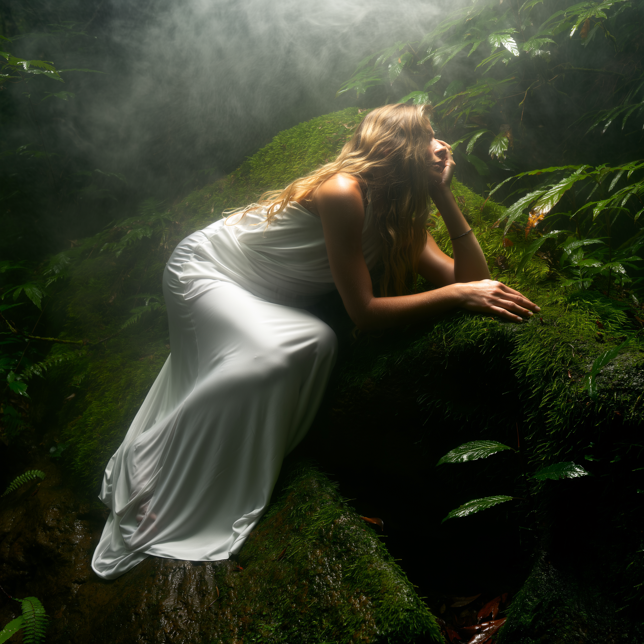 A woman clad in a softly flowing white silk gown emits a gentle, radiant white glow that softly diffuses around her figure as she leans spontaneously against a mossy boulder within a shadowy dark green forest. Her long golden hair cascades loosely, catching faint glimmers of the muted overcast daylight filtering through the dense, damp foliage overhead. Her pose is natural and uncontrived. Her skin reveals delicate textures of natural warmth and subtle pores, slightly flushed by the cool, humid forest air. The deep green leaves and moss around her shimmer with moisture, enveloped by a heavy, thin ethereal white fog that drifts through the scene. The white silk fabric of her gown wrinkles gently at the folds, emphasizing tangible texture. The image is captured from a casual, slightly angled iPhone perspective, enhanced by soft focus, light haze, and the characteristic warm, diffuse shadows typical of spontaneous forest shade photography.