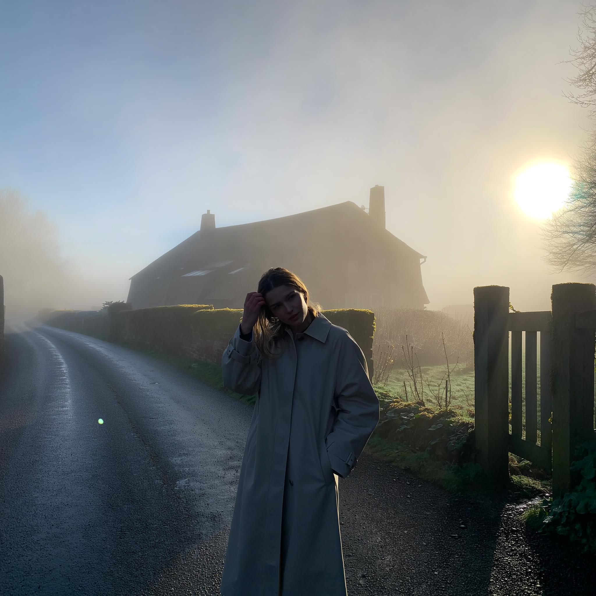 A young woman clad in a sleek, minimalist trench coat stands still on a slick, rain-dark asphalt path winding past a rustic cottage whose outlines blur softly into thick, lingering fog. Her loose hair clings damply to her neck as she tilts her chin slightly forward, breath visible in the cold, and one hand slides into her coat pocket while the other brushes a stray strand from her face. The dense mist swallows color into pale greys and muted greens of moss clinging to gateposts, while a faint, diffused dawn light softly pools through the haze, casting gentle luminance with a subtle lens flare near the blurred sun. The iPhone's grain texture whispers through shadowed corners; droplets bead quietly on wilting leaves, and the faint tap of distant dripping condensation layers the stillness. The shot, caught from chest height with a hand-held, slightly tilted frame, leaves generous negative space above and around her, dissolving the world into quiet solitude—mistbound reverie, shot on iPhone