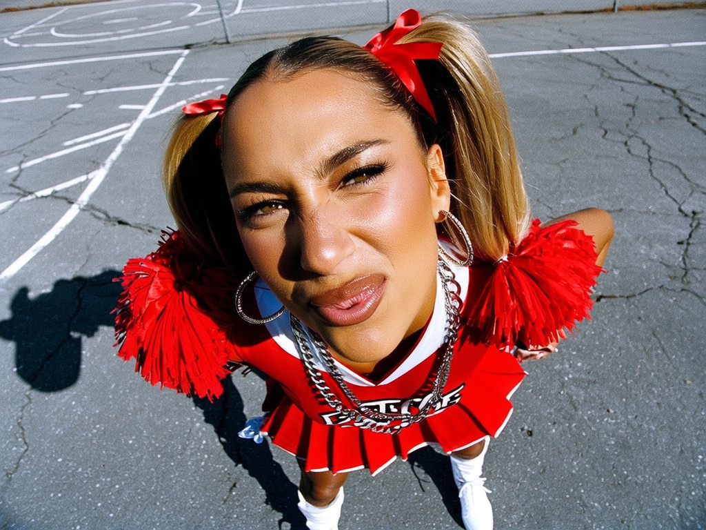 A wide shot of a woman with light brown skin, detailed natural skin texture apparent across her nose, cheeks, and forehead, with her hair styled in two high ponytails secured with bright ribbons, captured in a middle close-up from a top-down wide-angle perspective. She wears a vibrant red and white cheerleader uniform, featuring a fitted cropped top and pleated skirt, accessorized with large hoop earrings and a chunky silver chain. Her face is positioned close to the lens and slightly off-center, with a confident smirk and bright eyes looking just above the lens, her lips glossed and eyebrows sharply defined. The wide-angle lens exaggerates the volume and curves of her uniform, pushing her accessories and raised pom-poms forward to appear oversized and dominant.