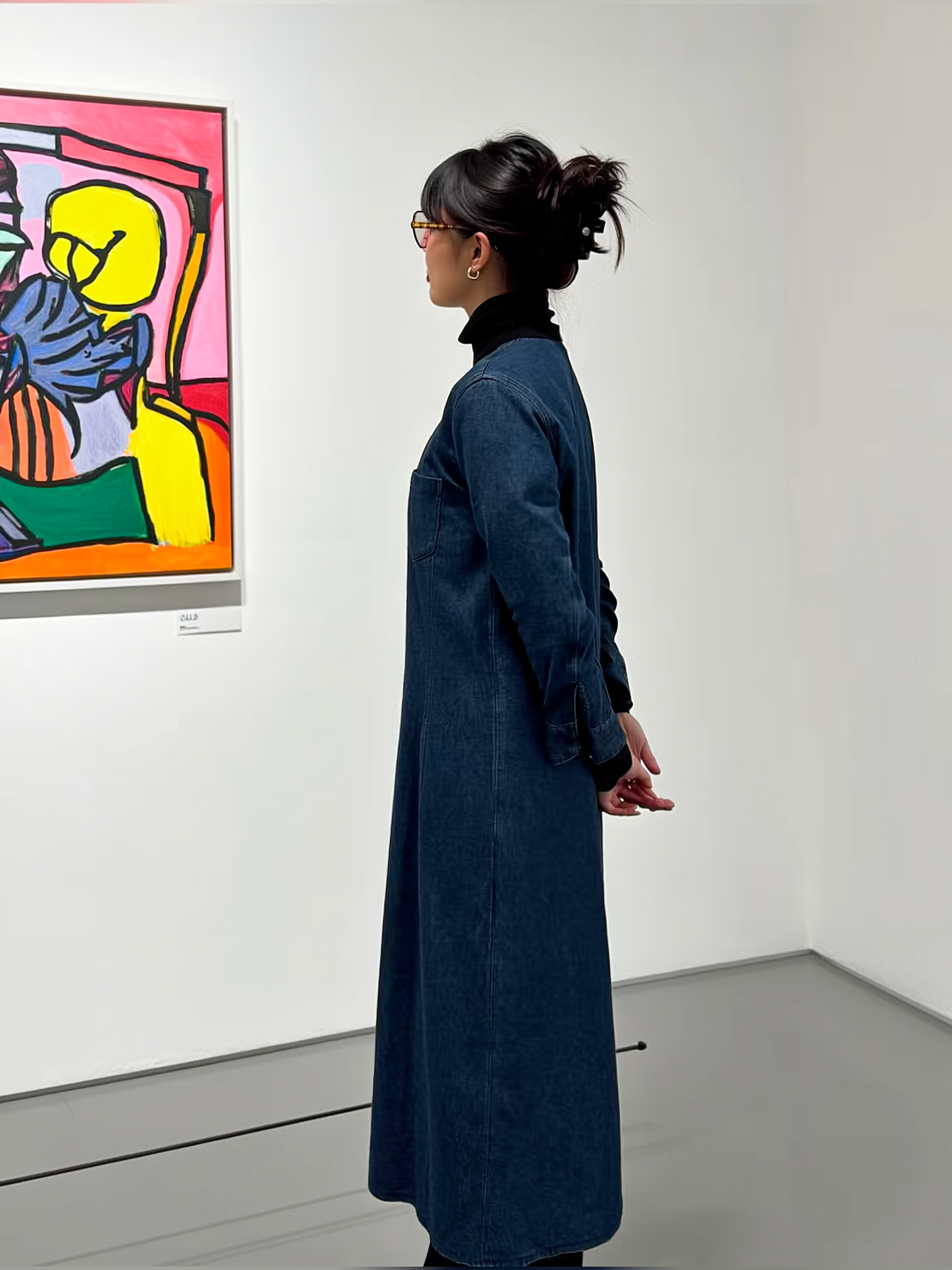 High-resolution iPhone photograph tightly composed to capture a stylish young woman standing sideways at a medium distance from a pristine white gallery wall, illuminated by soft, diffuse natural gallery lighting that enhances depth and texture. She gazes thoughtfully at a bright, bold painting rendered in vivid colors and abstract forms. Seen from the side, her relaxed posture features hands gently clasped behind her back, subtly engaging with the artwork. She wears a layered ensemble consisting of a long, dark denim dress worn over a sleek black turtleneck, the fabric textures crisply defined with delicate creases and natural fall. Her hair is styled in a casual messy bun, complemented by trendy glasses that add an intellectual, fashion-forward edge. The clean, graphic white wall serves as a minimalist backdrop, creating a calm horizontal rhythm and an editorial feel that celebrates modern art culture within the serene gallery space.