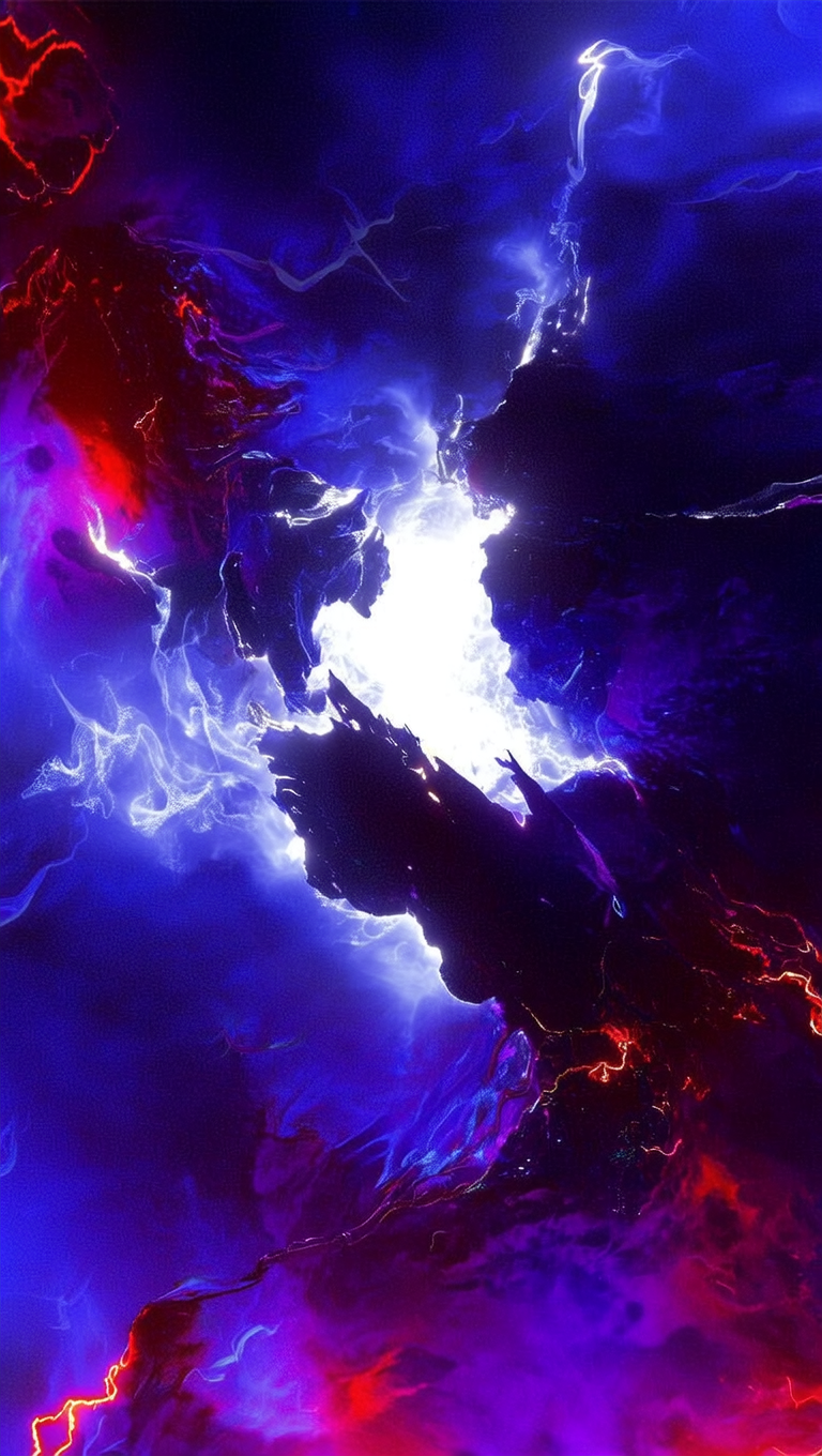 Emanating from a seething ground of cobalt and violet, fractured planes collide in restless disarray, slices of incandescent white light cleaving through shadowed forms that waver like haunted echoes. Ethereal textures ripple with grainy phosphorescence, where spectral silhouettes—half-seen and half-remembered—dissolve into layers of glitching haze and translucent veils. The composition breathes with a charged tension, caught between quiet dissolution and surging latent energy, as warped fragments pulse and cascade like ghostly runes etched in digital ether. Faint traces of abstract contours shimmer in suspended motion, their distorted edges bleeding softly into a chimeric spatial void that folds impossibly inward. This vision unfolds in an interplay of incandescent spectral blues and burning crimson bursts; its fluid fractures echo the restless pulse of a fractured psyche navigating liminal realms of memory and emotion—analog grain abstraction.