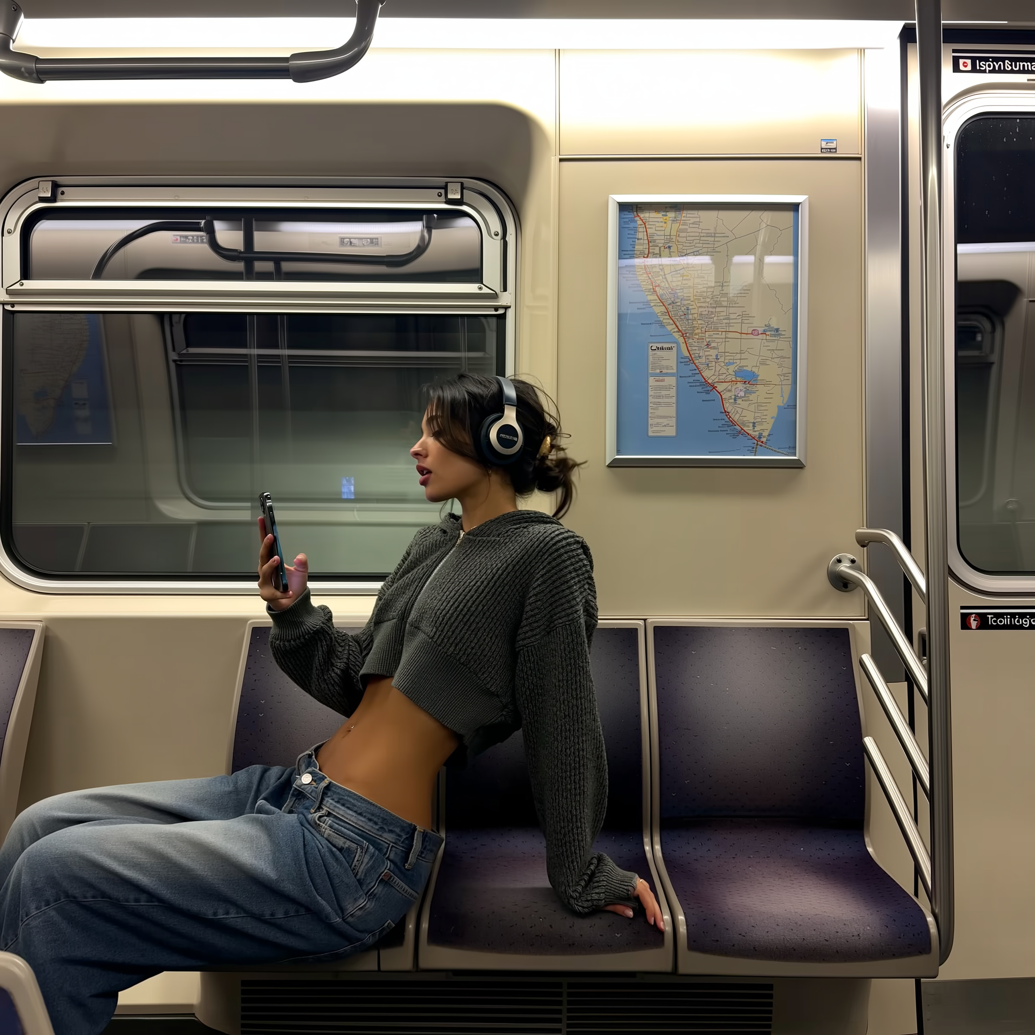 A stylish side view photo inside a subway car, showing a young woman sitting on the muted-tone seats along the subway wall. She wears a cropped hoodie paired with low-rise jeans, headphones over her messy hair, and her lips slightly parted in a natural, introspective expression. Her relaxed body language captures a spontaneous moment of self-confidence during the ride home. The subway door is subtly visible at the right edge, and above her head is a framed subway map glowing softly in the diffused interior lighting. Reflections of the subway's dim tunnel appear in the window behind her, adding ambient depth. The lighting gently illuminates her detailed knit-textured hoodie and denim textures. She holds a smartphone casually in one hand, as if taking a mirror selfie, with soft, natural gazing directed slightly sideways. The seats have uniform muted colors with fabric texture, consistent throughout the frame. Subway handrails and interior details add authenticity to the casual, urban mood of the scene.