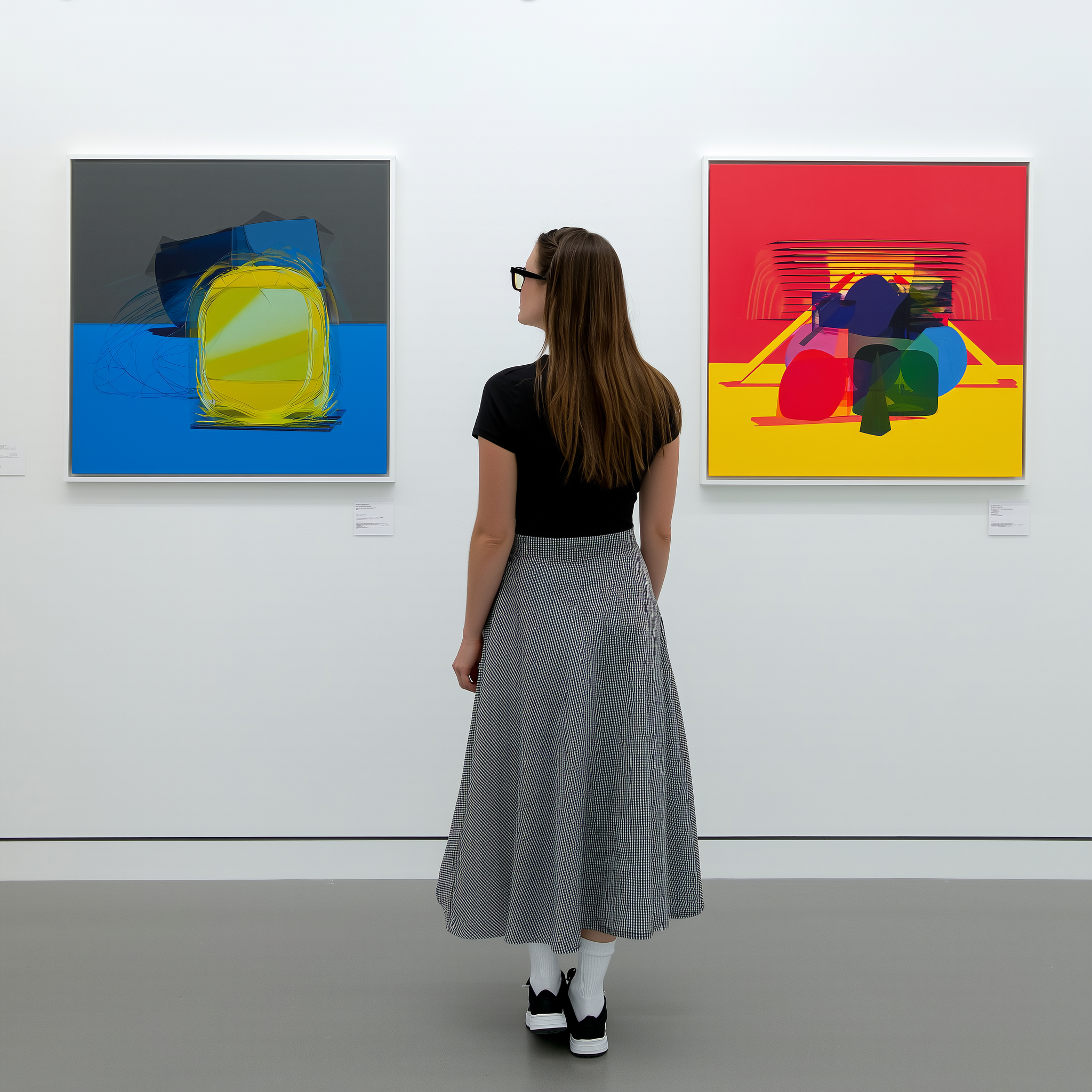 High-resolution iPhone photograph tightly composed to capture a young woman standing centered at mid-distance from a pristine white gallery wall displaying two large, modern artworks side by side. She is seen from behind and slightly to the side, her posture relaxed with arms naturally resting by her sides. She wears a sleek, black fitted top paired with a flowing, long checkered skirt whose fabric softly creases above classic black sneakers and crisp white socks. Her long hair is parted neatly, cascading naturally, and she sports large, black-rimmed glasses that catch the diffuse, even museum lighting which gently sculpts the textures of the textile layers—highlighting the subtle weave of the skirt, the smooth finish of the top, and the soft contrast of the socks and sneakers. The graphic white gallery wall and vibrant modern artworks create a calm, clean horizontal rhythm, framing this candid moment of stylish art engagement with an editorial, fashion-forward aesthetic.
