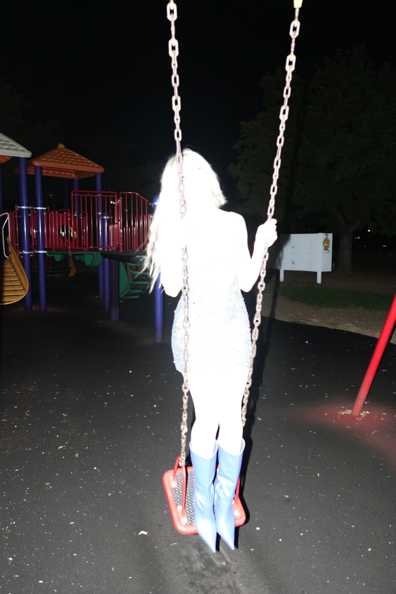 A spontaneous iPhone snapshot at night on a playground, capturing an Afro-Latin woman standing on a swing mid-motion. The intense direct flash overexposes her completely, bleaching out all facial features and details of her glittery mini-dress and high boots, leaving only a glowing, ghostly silhouette. Her playful and defiant pose is frozen in imperfect, candid framing, surrounded by the dark outlines of playground equipment, creating a surreal and abstract visual effect.