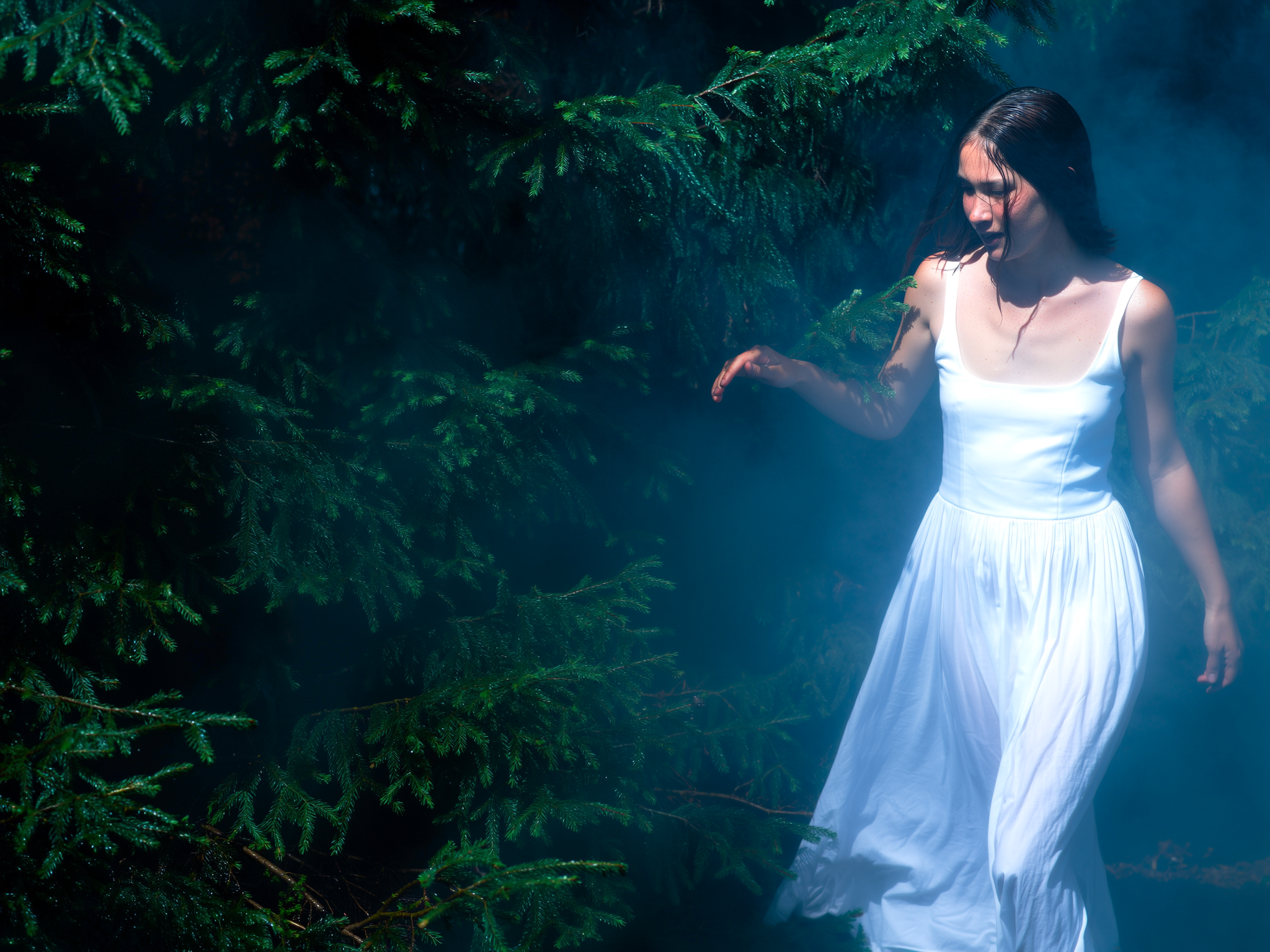 A girl clad in a softly flowing white dress emits a gentle, radiant white glow that softly diffuses around her figure as she walks spontaneously through a shadowy, dense dark green pine forest shrouded in thick, ethereal blue-tinged mist. Her pose is natural and uncontrived, with delicate movements as birds flutter softly nearby, their subtle motion captured in the humid air. Her skin shows delicate textures of natural warmth and pores, slightly flushed by the cool forest atmosphere, while stray wisps of hair fall casually around her face, catching faint glimmers of muted overcast daylight filtering through the dense, damp pine foliage. The deep green needles shimmer subtly with moisture under the soft light, enveloped by a thin, ethereal white fog blending with the blue mist that drifts gently through the scene. The white fabric of her dress wrinkles gently at the folds, emphasizing tangible texture. The image is captured from a casual, slightly angled iPhone perspective, heightened by soft focus, light haze, and the characteristic warm, diffuse shadows typical of spontaneous forest shade photography.