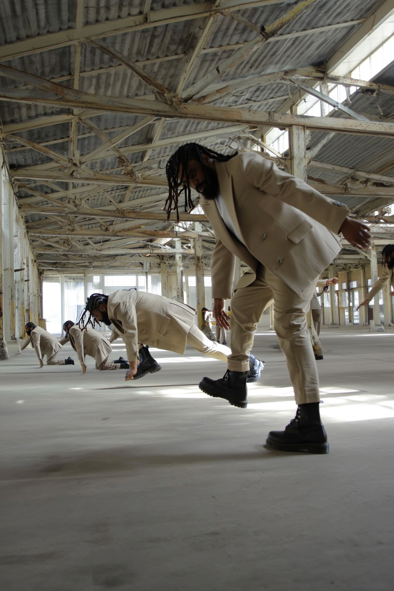 An imaginative, casually surreal iPhone snapshot featuring a man with sculpted dreads duplicated several times within a large empty industrial hall with exposed beams. Each figure wears the same bone-colored structured outerwear and heavy boots, captured in varied poses—stretching, squatting, and leaning rhythmically across the space like glitching time snapshots. Natural daylight streams through high windows, casting soft, realistic shadows and highlighting detailed texture in the fabric, hair strands, and weathered industrial surroundings. The composition employs inventive framing with overlapping and unexpectedly scaled figures, from close-up leaning forms to distant walking silhouettes, creating a visually dynamic, spontaneous scene with a subtle surreal cadence typical of candid iPhone photography.