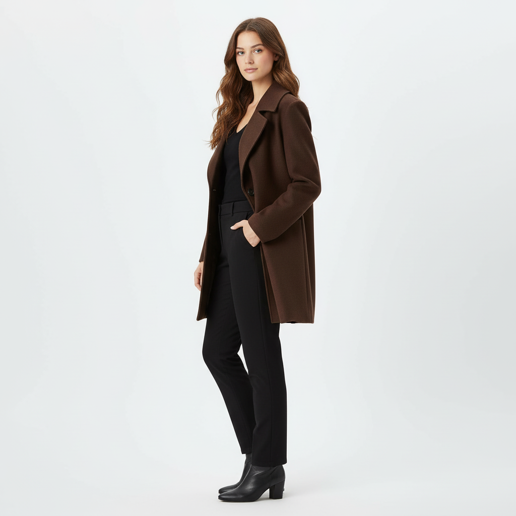 A highly detailed, photorealistic fashion photograph of a beautiful woman model with brown hair, slim athletic build, full-body side profile view fully visible, entire height captured completely without any cropping, wearing the exact clothing item from the provided product reference image fitted perfectly on her body as the focal outfit, soft natural lighting, seamless plain white studio background, ultra-high resolution, sharp focus, no distortions, no text or logos.