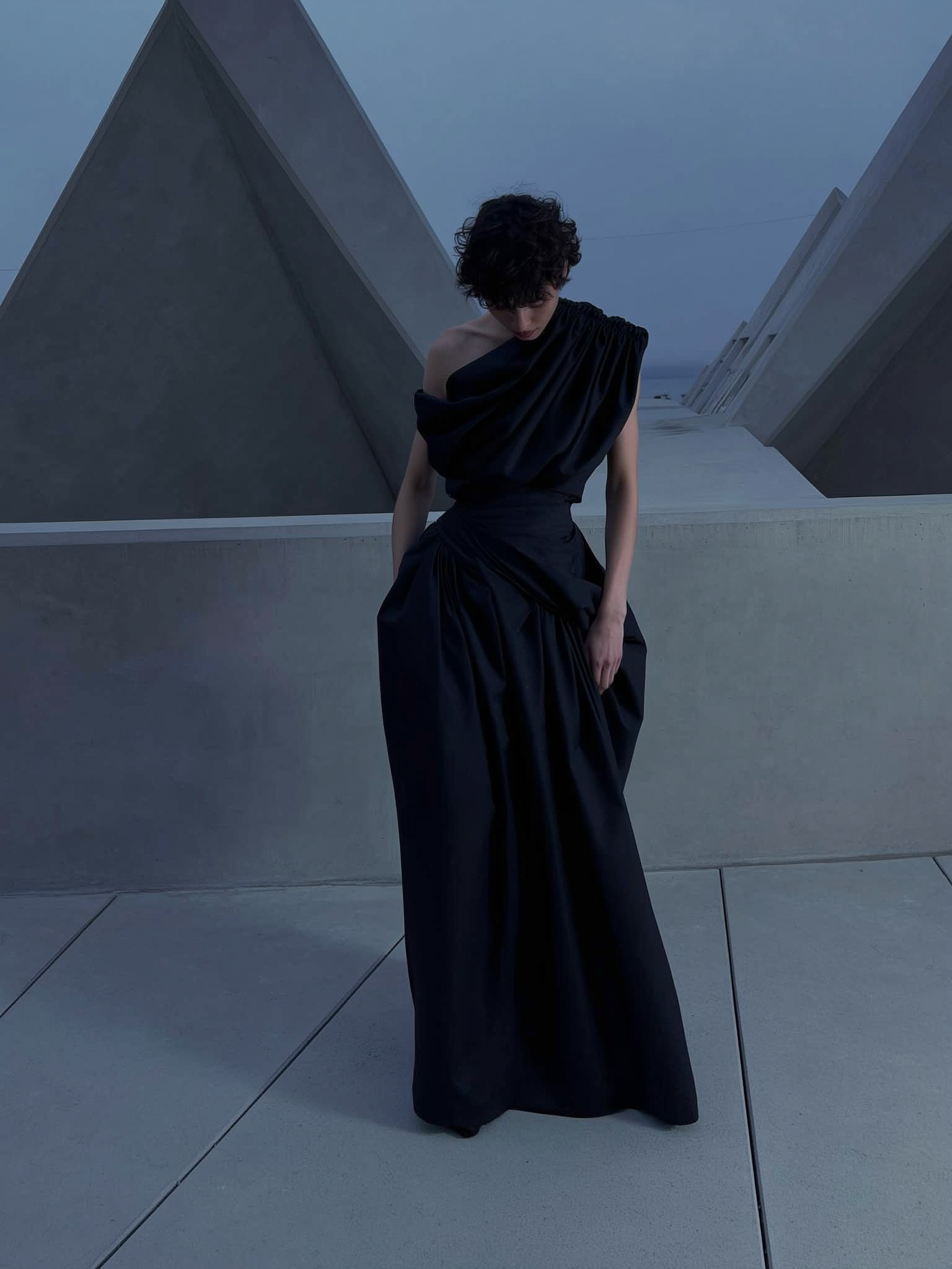 A softly dim-lit dusk-inspired iPhone snapshot featuring a model in an avant-garde floor-length black gown by Rick Owens, showcasing structured sculptural draping and an asymmetrical neckline with gathered fabric layered over one shoulder. The model stands slightly off-center against angular Brutalist concrete architecture under muted cool dusk hues of greys and shadowy blacks. Soft, diffused ambient twilight lighting accentuates the matte textures of the gown and subtle imperfections of the concrete surfaces. The composition employs a gently elevated viewpoint tilted downward, casually framing the model within expansive negative space, evoking relaxed asymmetry, quiet introspection, and intimate moody minimalism in a muted twilight palette.