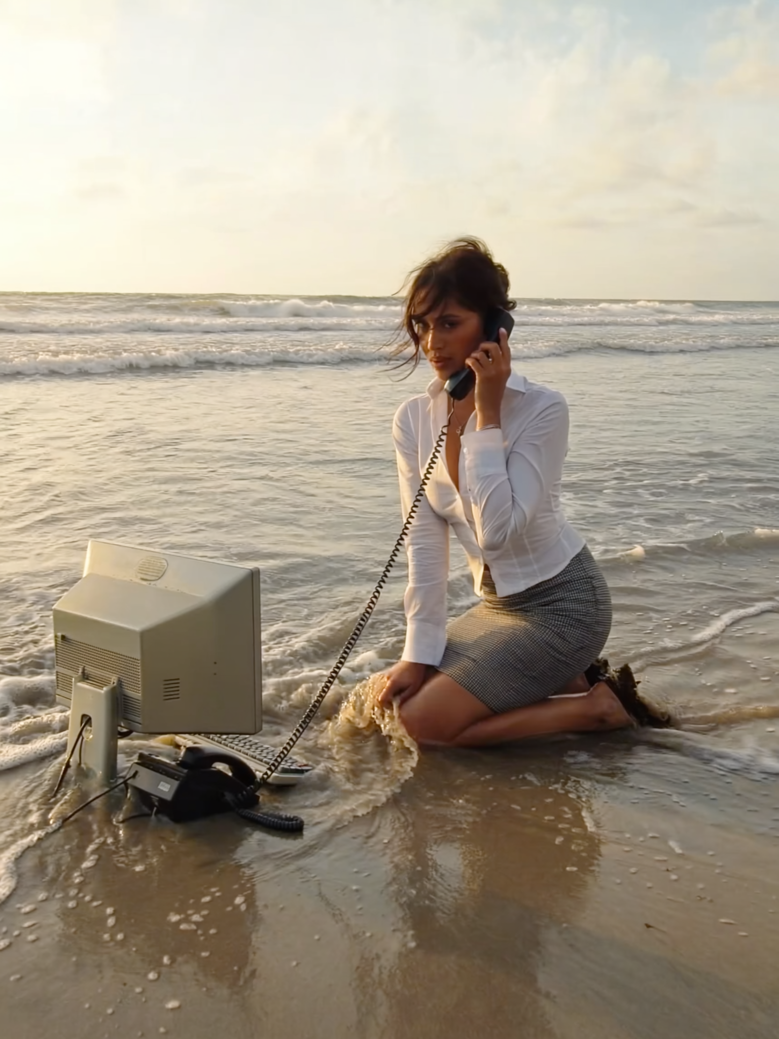 With waves lapping rhythmically against the shore, a woman kneels on the wet sand, waves gently reaching her knees as she clutches a retro landline phone receiver to her ear. Dressed in a crisp white blouse paired with a fitted houndstooth pencil skirt, she exudes an aura of corporate poise amid the surreal coastal setting. The sunlight casts warm golden hues, long shadows stretching across the sand, highlighting an old beige CRT monitor and full-sized keyboard nestled beside a desk phone tangled with coiled cord, partially covered in clinging seaweed. The photo has a grainy quality, suggesting it may be a still from a video or taken with an older digital camera. Her hair is gently tousled by the sea breeze, and her expression is focused and composed beneath the muted glare. Quick snapshots create a soft-focus effect at the edges, and muted colors swirl into a nostalgic haze, capturing an absurd twist on remote work culture. The gentle surf brushes against the office chair’s legs, blurring the divide between professionalism and nature’s whimsy—early-2000s digicam snapshot, grainy quality.