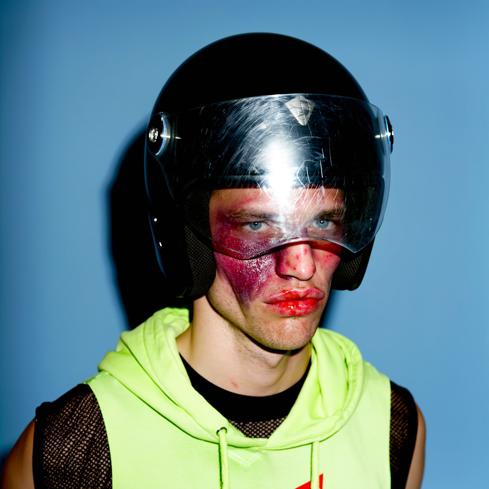 He’s framed in a medium close-up against a matte baby blue studio backdrop, the shot uncomfortably hand-held with slight asymmetry. His face is partially obscured by a scratched, glossy black motorcycle helmet with a slightly fogged visor that reflects the harsh studio lighting. His cheek is bruised in deep purples and bruised reds, lips swollen and glistening like a prizefighter post-bout, yet his deadpan stare pierces through the visor with icy electric blue eyes. He wears a black mesh shirt under an unzipped neon green sleeveless hoodie, the collar peeking out just enough to clash with the bruised softness of his features. The whole moment holds a violent yet glamorously unbothered tone, like a Y2K skater who’s just stepped off a backstage ramp ready for the flash. The lighting casts soft shadows and mild flash glare on the visor’s scratches, emphasizing texture and raw grit.