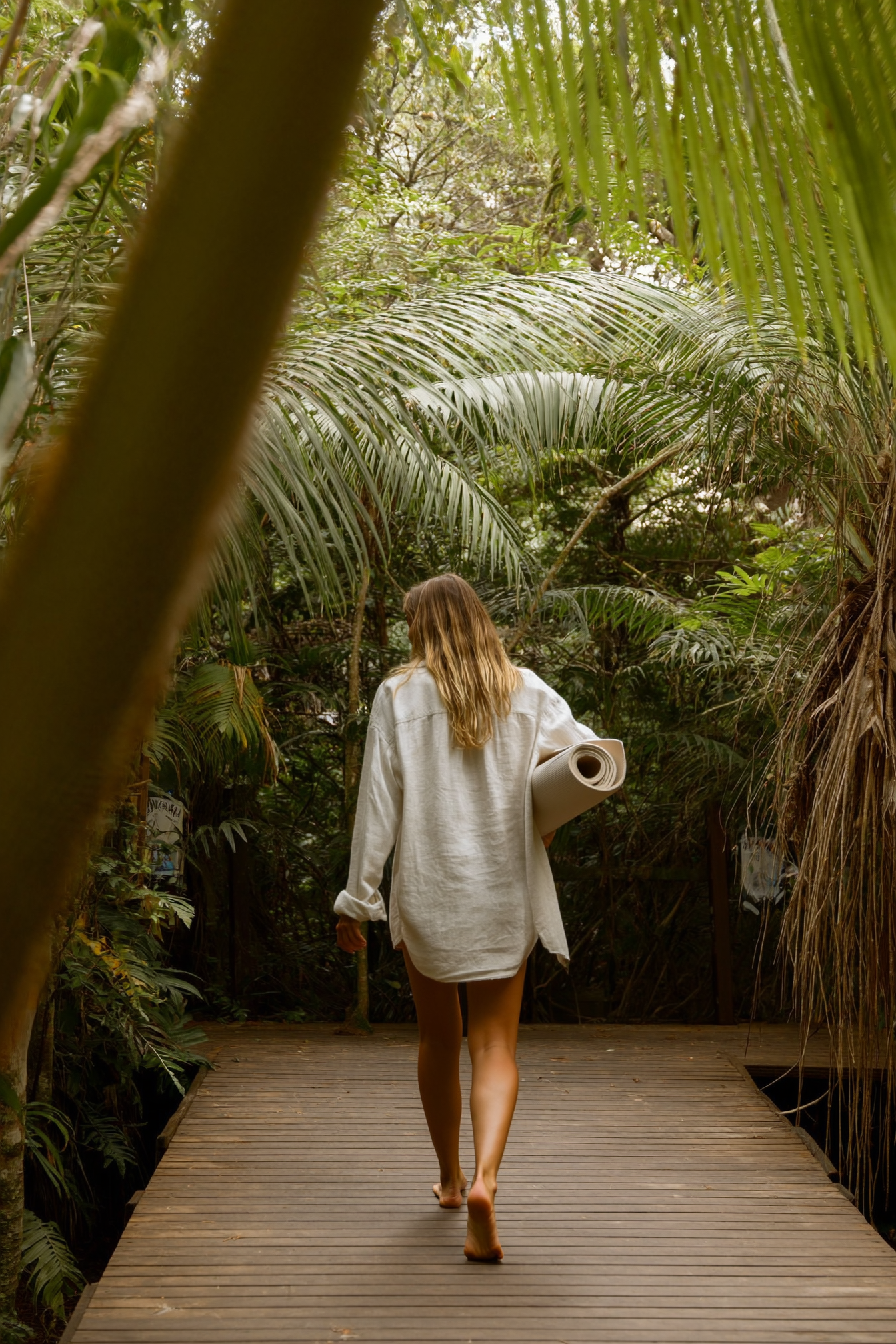 A woman in an oversized linen shirt walks barefoot across a wooden platform, holding a rolled-up yoga mat, framed from behind. Ferns and tropical trees create a canopy around her. The light is warm and filtered through leaves, the iPhone photo has a raw, spontaneous travel-journal vibe.