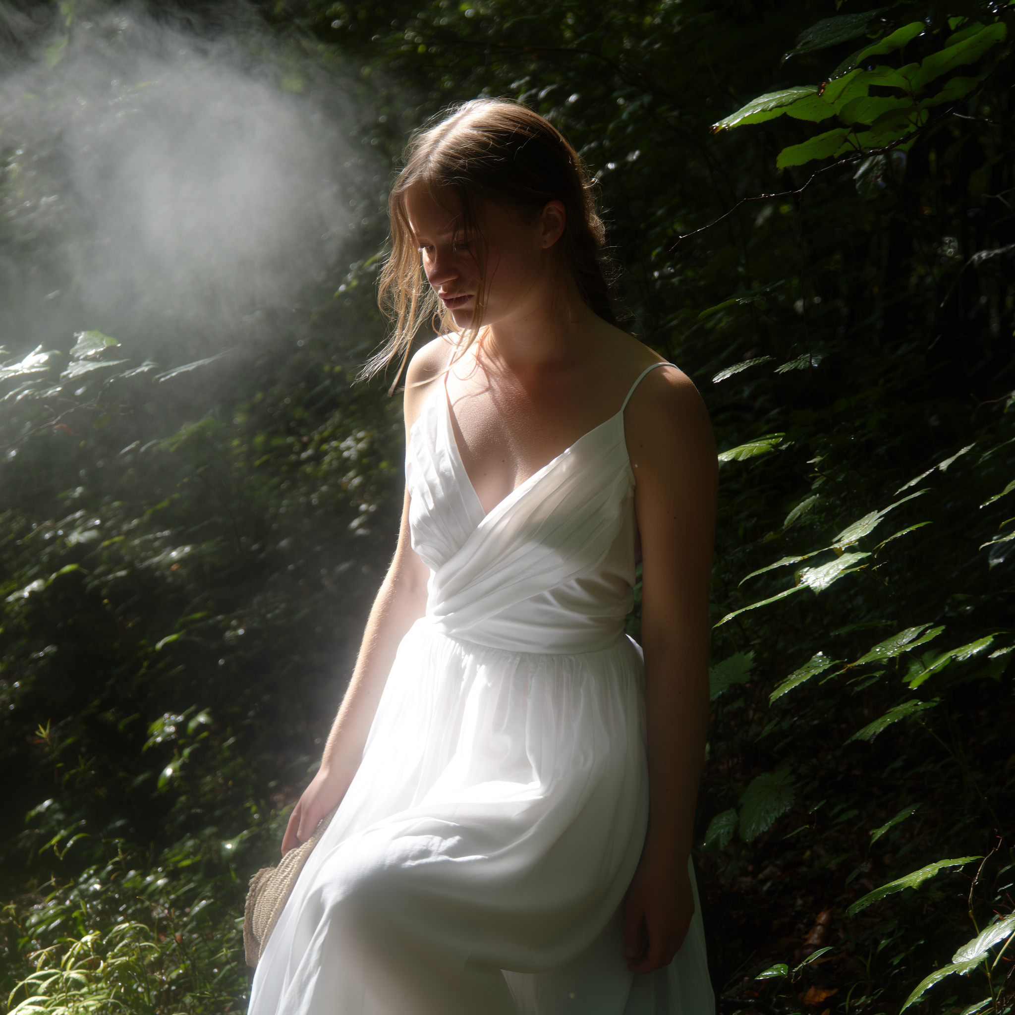A delicate young woman clad in a softly flowing white dress emits a gentle, radiant white glow that softly diffuses around her figure as she stands naturally beside a shadowy dark green forest. Her pose is uncontrived, with subtle hints of melancholy as she gazes quietly. Her skin reveals delicate textures of natural warmth and pores, slightly flushed by the cool, humid forest air. Stray wisps of her hair fall casually around her face, catching faint glimmers of muted overcast daylight filtering softly through deep green leaves that shimmer with moisture. A thin, ethereal white fog drifts gently through the scene, enhancing the quiet intimacy. The white fabric of her dress wrinkles gently at the folds, emphasizing tangible texture. Captured from a casual, slightly angled iPhone perspective, the image is heightened by soft focus, light haze, and the characteristic warm, diffuse shadows typical of spontaneous forest shade photography.