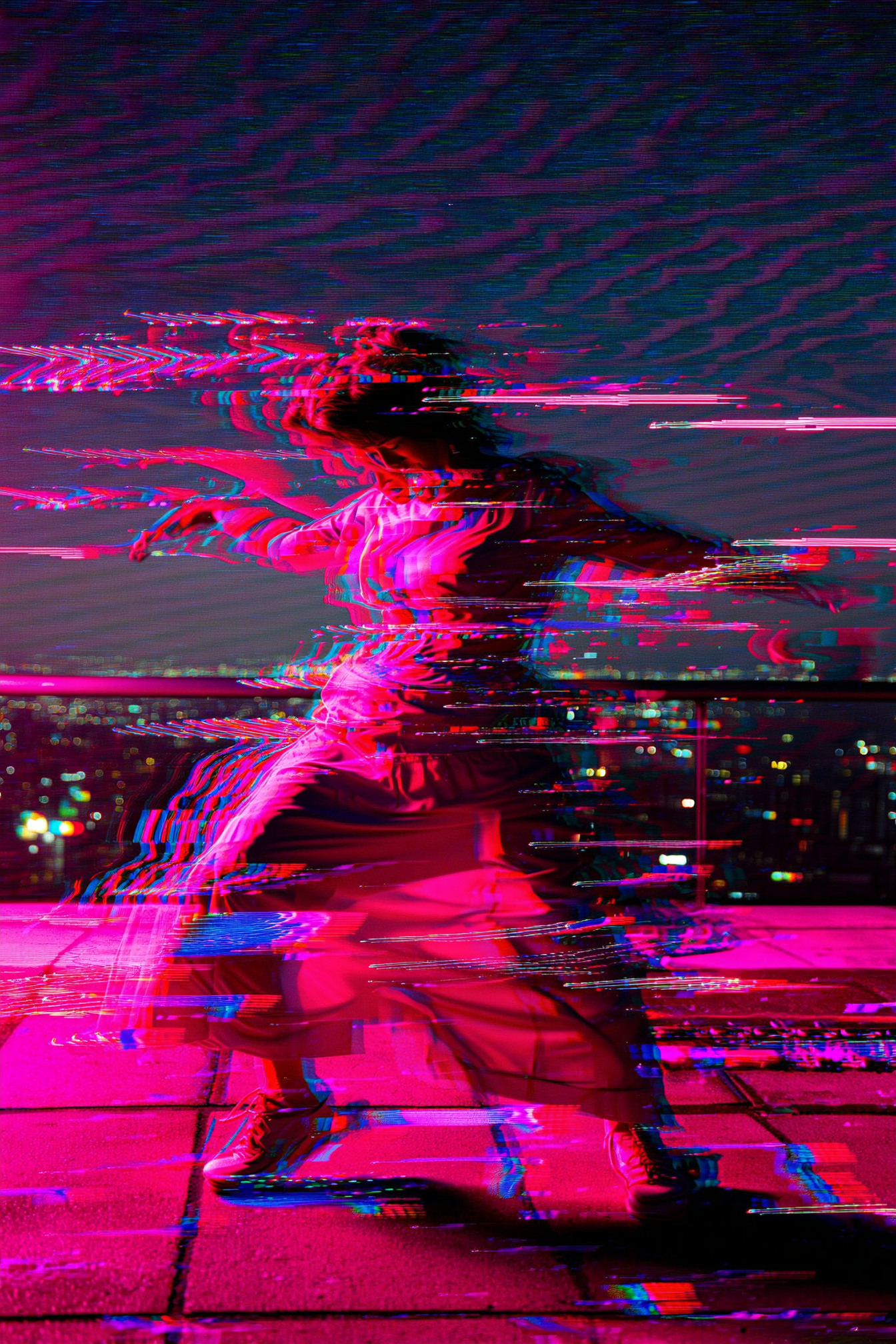 A woman dances on a neon-pink lit urban rooftop at night, her fluid silhouette multiplied through jittered frame skips that create overlapping ghost images shifting in fragmented choreography. Soft digital shadows ripple outward in pixelated waves, blooming into erratic glitch patterns reminiscent of light leaks and corrupted analog film. Her form twists and dissolves into abstract shards of warm magenta, rose, and electric pink hues, interspersed with horizontal scan-line distortions and subtle RGB color separations that flicker like a malfunctioning CRT screen. The composition tightly crops her mid-motion figure, emphasizing the fractured edges and layered overlapping images against a grainy, textured backdrop hinting at distant blurry city lights. A moiré pattern hums faintly across the surface, blending organic human movement with synthetic digital disruption. This fusion of expressive motion and glitch art evokes fleeting memory, ephemeral existence, and nostalgic technological decay under a cyberpunk-inspired pink glow.