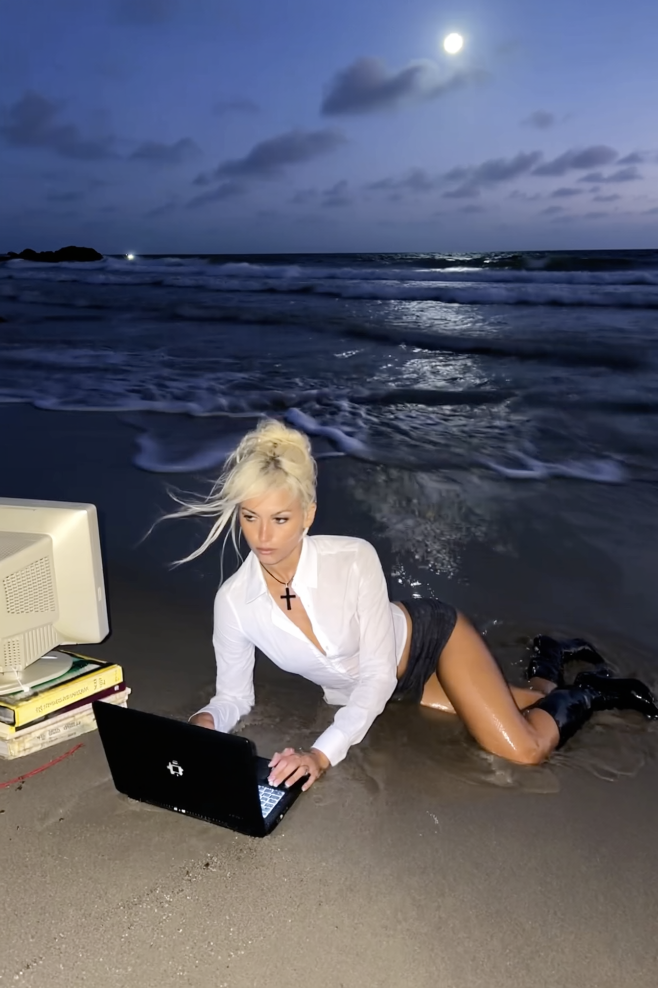 With waves lapping rhythmically against the shore, a blonde woman lies propped on one elbow at the moonlit beach edge, her platinum ponytail tousled by the subtle coastal breeze. She wears a crisp white unbuttoned dress shirt paired with dark high-waisted shorts and glossy black boots glistening with wet grains of sand, while a sleek black laptop, half-buried in damp sand, hums quietly beneath her fingers. The grainy quality of the photo suggests it may be a still from a video or taken with an older digital camera, the sharp focus softened slightly at the edges in quick snapshots that capture the surreal convergence of ocean and office. A black cross necklace swings faintly, catching the pale gleam from the laptop screen. Behind her, the dark ocean rolls under a cloudy twilight sky, faint silver reflections shimmering across the incoming waves. Nearby, a stack of yellowed books and a beige CRT monitor rest awkwardly on the sand’s edge, underscoring the absurd twist on remote work culture. Muted colors swirl into a nostalgic haze, while the breeze lifts loose strands of damp hair and rustles her shirt. The serious, composed expression on her face contrasts poignantly with the serene beach surroundings—early-2000s digicam snapshot, grainy quality.