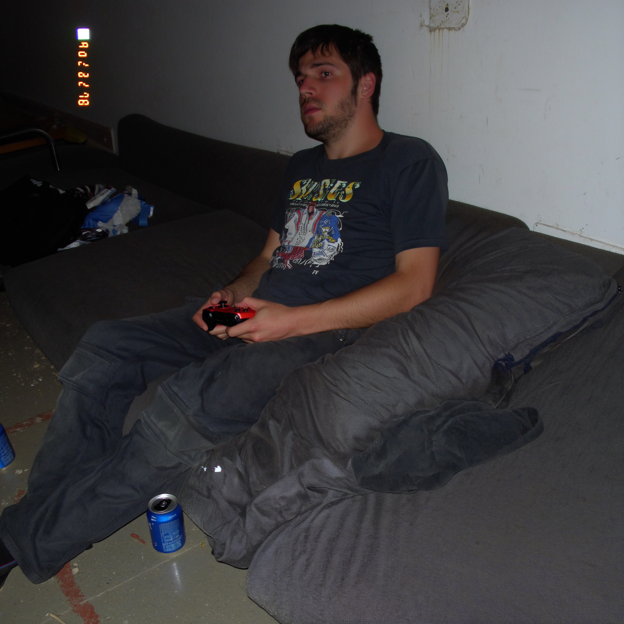 A sudden pop from the built-in flash washes over a man slouched on a threadbare couch, his graphic T-shirt catching a faint blur as he grips a game controller. Nearby, a dented soda can shimmers on the scuffed floor, its edges softened by low CCD sensitivity. The flash etches a harsh shadow onto the cracked paint of the wall behind, while faint pixel blocks jitter across the darkened folds of the fabric. The man's outline bleeds into the muted tungsten glow mixing with a hint of fluorescent overhead light, edges fuzzing with each tiny jitter of the handheld zoom. A slight tilt twists the scene off-kilter, the timestamp “04 MAR 2003 23:18” flickering in the corner alongside a half-drained battery icon. The photo quality is low-resolution and somewhat grainy.—early-2000s digicam snapshot, grainy low-res quality