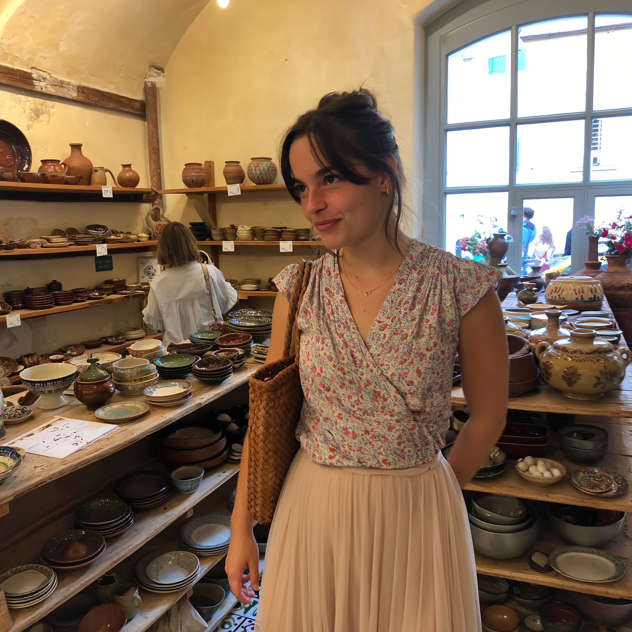 A candid photo of a young Slovenian woman shopping in a quaint local boutique in Bari, Italy. She wears a delicate floral blouse softly tucked into a light beige pleated skirt that flows naturally as she browses. Her hair is loosely tied back with strands framing her face, and she carries a woven leather handbag casually over one shoulder. The boutique features rustic wooden shelves filled with artisanal ceramics and linen textiles, with weathered cream-colored walls and soft Mediterranean daylight filtering through a large window. Her face shows a relaxed, curious expression, with natural skin texture and subtle freckles visible. The composition is spontaneous and slightly off-center, as if caught in a fleeting moment, capturing the warm, intimate, and authentic vibe of an iPhone snapshot inside a charming southern Italian store.