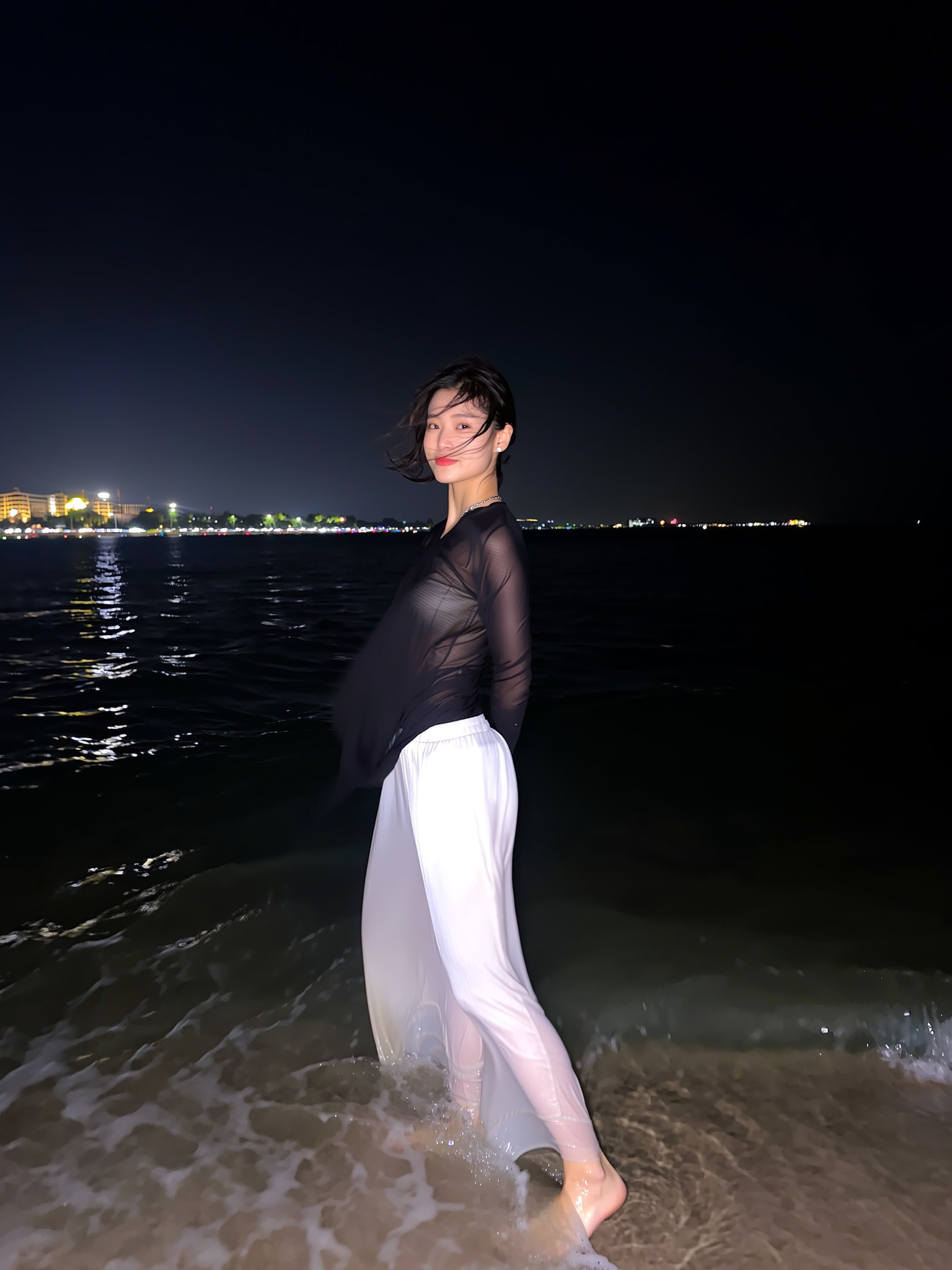A delicate flash unfurls against the ink-black expanse, revealing her poised profile as she stands barefoot in shallow surf where city lights shimmer distantly across the quiet waves. Her sheer black top catches the faintest breeze, flowing softly alongside loose, fluid beach pants that ripple gently with the tide. Strands of dark hair fall tousled, kissed lightly by the night’s subtle dampness, while ambient reflections dance quietly on the water’s surface around her feet. The crisp sharpness of her calm expression anchors the scene, framed slightly off-center within velvety darkness that swells expansively, embracing an unhurried elegance and serene magnetism—flash-lit elegant beach snapshot, captured on iPhone.