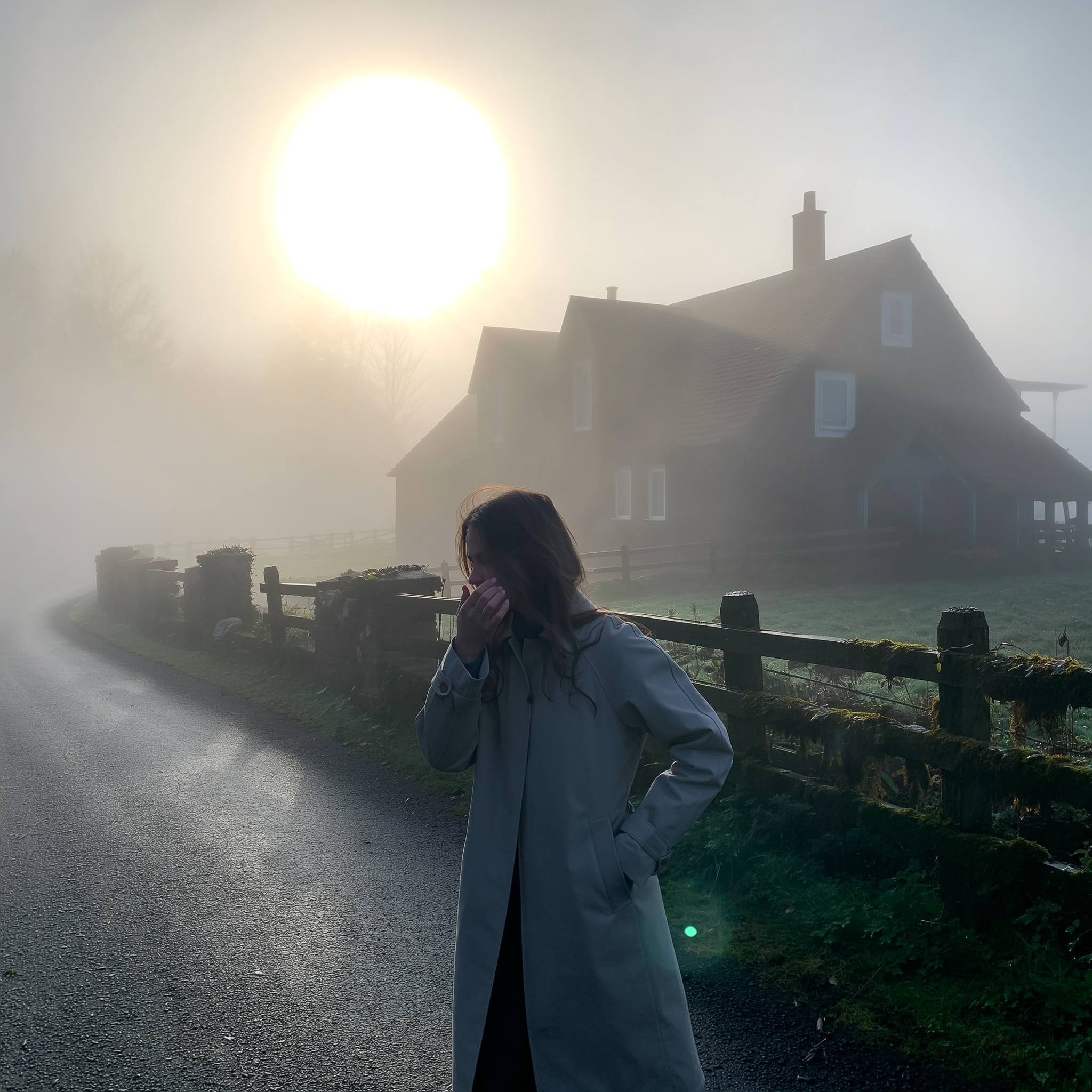 A young woman clad in a sleek, minimalist trench coat stands still on a slick, rain-dark asphalt path winding past a rustic cottage whose outlines blur softly into thick, lingering fog. Her loose hair clings damply to her neck as she tilts her chin slightly forward, breath visible in the cold, and one hand slides into her coat pocket while the other brushes a stray strand from her face. The dense mist swallows color into pale greys and muted greens of moss clinging to gateposts, while a faint, diffused dawn light softly pools through the haze, casting gentle luminance with a subtle lens flare near the blurred sun. The iPhone's grain texture whispers through shadowed corners; droplets bead quietly on wilting leaves, and the faint tap of distant dripping condensation layers the stillness. The shot, caught from chest height with a hand-held, slightly tilted frame, leaves generous negative space above and around her, dissolving the world into quiet solitude—mistbound reverie, shot on iPhone