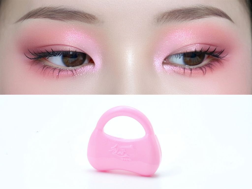 In the top half, a close-up of a woman’s eyes styled with makeup inspired by the iconic Barbie doll palette. Her eyeshadow is a delicate blend of soft pastel pinks with a hint of blush rose, applied in a satin-matte finish that mimics the smooth plastic sheen of a Barbie doll’s face but retains natural skin texture such as visible pores and fine creases. The eyelids are lightly dusted with a sheer pastel pink shimmer that catches the light softly, reminiscent of a Barbie's flawless complexion. The lower lash line carries a subtle hint of muted coral blush, adding a soft contour without harshness. Her eyelashes are naturally feathered and spaced, with a gentle lift that suggests lively expressiveness. The skin around her eyes remains authentic and real, with soft lighting that brings out a gentle glow, as if lit by soft daylight through a window, creating a candid, spontaneous look.