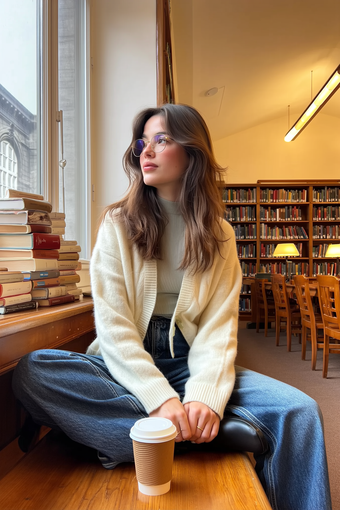 A young woman sitting cross-legged on a polished wooden bench near a tall, classic library window with muted natural light filtered through sheer curtains, casting soft, diffused shadows around. She wears a layered, light cream knit cardigan over a pale sage ribbed turtleneck, paired with high-waisted vintage-inspired mom jeans featuring rich worn denim textures, complemented by round metal-framed glasses with a subtle antique gold finish. Her chestnut hair flows loosely with slight waves, framing a thoughtful expression with her skin showing natural texture and warmth. A steaming paper coffee cup with a textured cardboard sleeve rests casually beside her on the bench. The library interior features tall wooden shelves densely packed with a variety of hardbacks, an orderly stack of books in warm earth tones nearby, and subtle brass reading lamps softly glowing in the background. The lighting is warm artificial overhead library lighting mimicking typical indoor conditions, creating gentle shadows and natural highlights enhancing tactile textures on fabrics, skin, and surfaces. The viewpoint is a spontaneous, slightly off-center iPhone snapshot from a low angle, capturing the candid mood with a level and natural horizon. The composition channels an authentic library-core, indie, 90s/2000s, and tumblr aesthetic with richly layered textures across clothing, accessories, hair, and skin, all evoking a genuine intimate moment. —high-fashion editorial, hyper-real texture fidelity