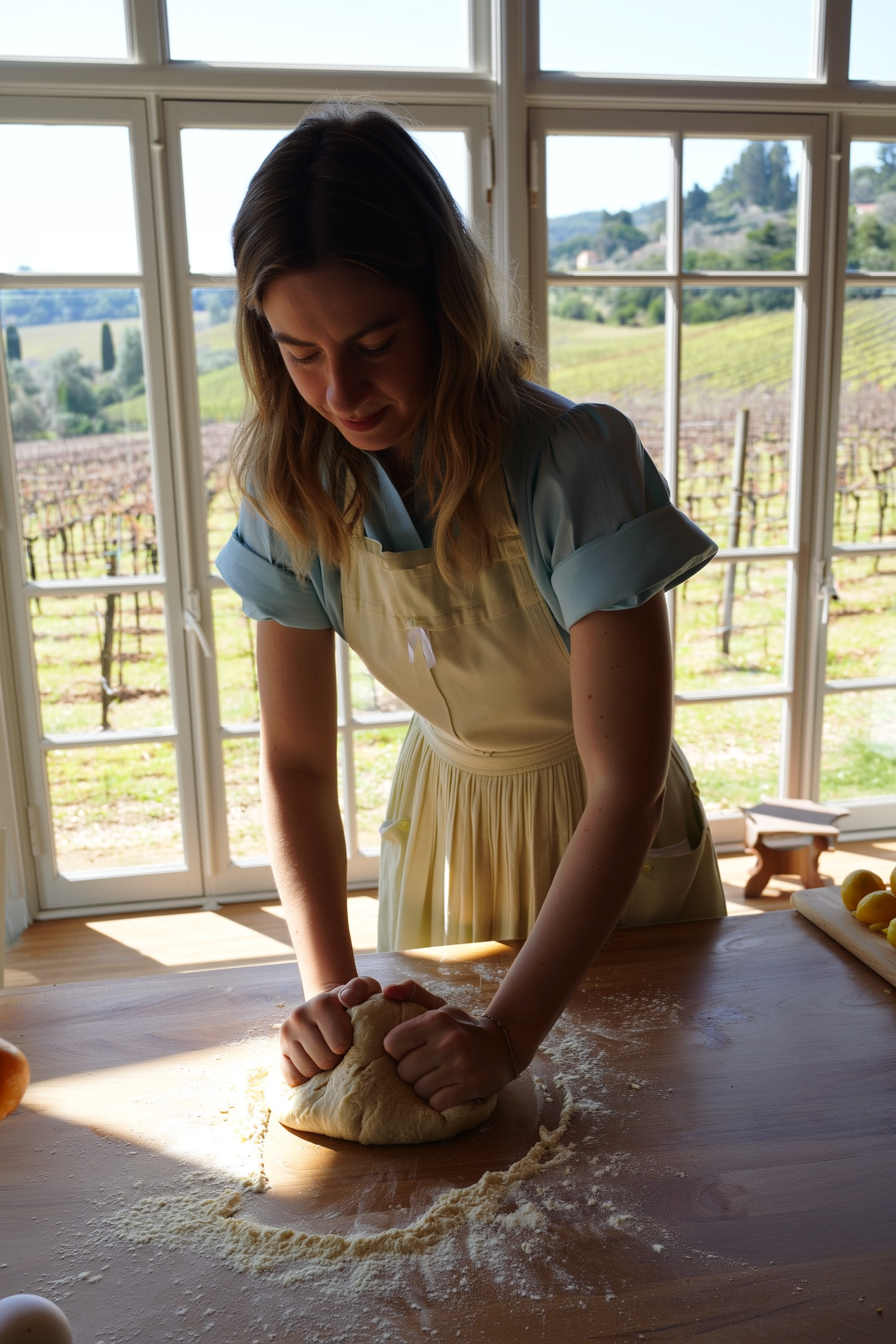 A European woman in a vintage white apron over a pastel green dress is kneading bread dough on a flour-dusted counter. Sunlight floods through the tall windows, showing a view of a vineyard just outside.