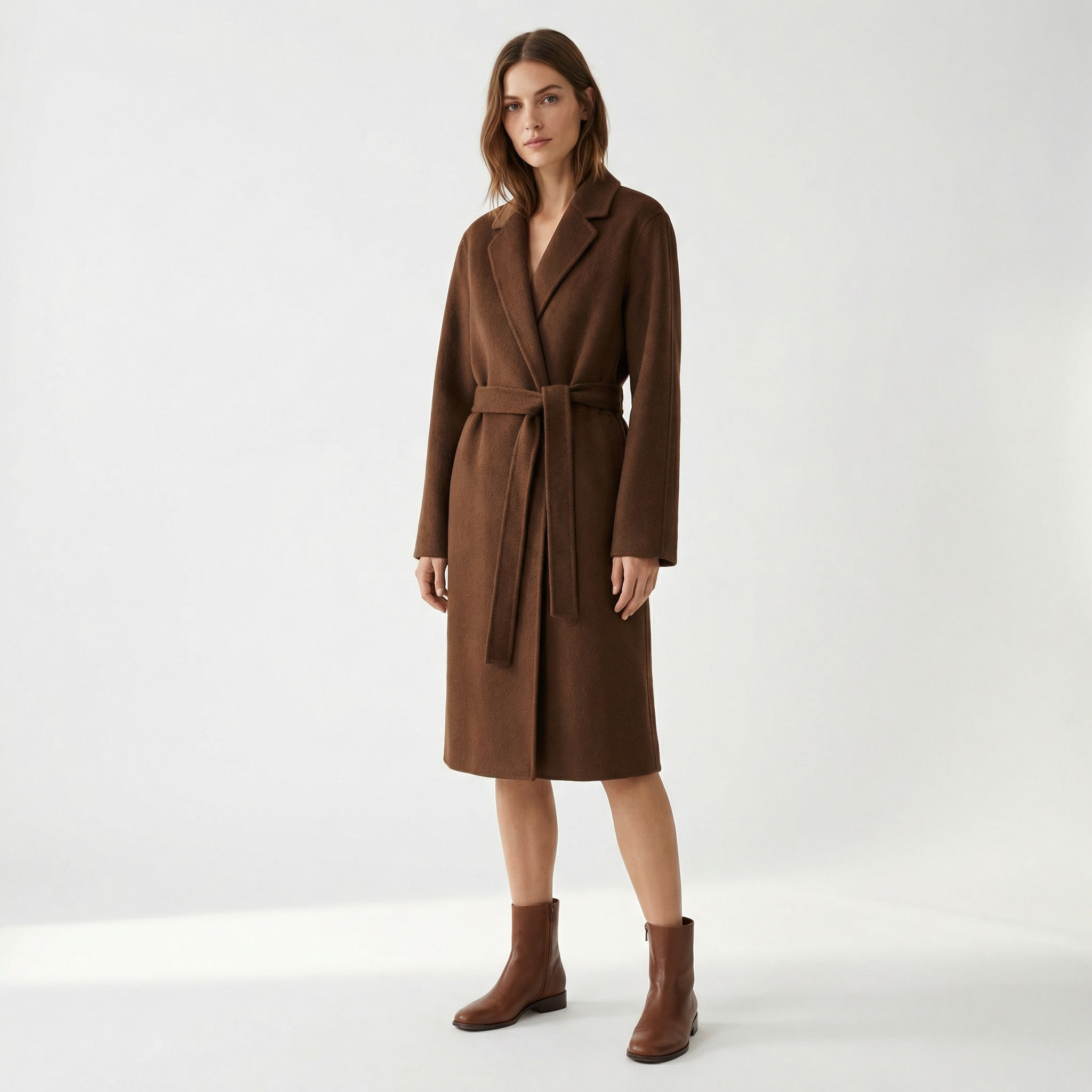A highly detailed, photorealistic fashion photograph of a beautiful woman model with brown hair, slim athletic build, full-body front view fully visible, entire height captured completely without any cropping, wearing the exact clothing item from the provided product reference image fitted perfectly on her body as the focal outfit, soft natural lighting, seamless plain white studio background, ultra-high resolution, sharp focus, no distortions, no text or logos.