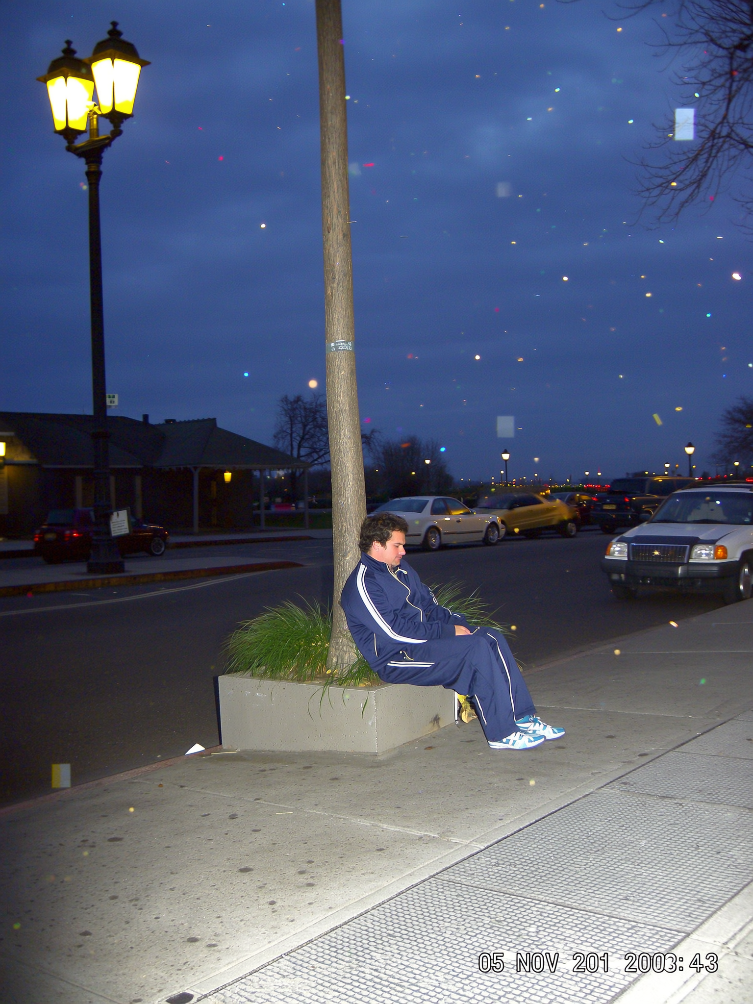 The soft glow of a late evening streetlamp washes over a quiet sidewalk where a man lounges on the edge of a concrete planter, his crisp tracksuit slightly wrinkled at the elbows as he slouches with easy intent. The on-camera flash pops suddenly, casting harsh shadows behind him and scattering pixel fringing across the dim pavement. Around the edges, CCD noise speckles dance like dust in a lazy breeze, while faint JPEG blocks blur the outlines of distant cars parked mid-frame. The composition is cocked at a Dutch tilt, making the lantern light skew the colours into muted blues and mustard yellows. Stamped faintly at the bottom-right, "05 NOV 2001 20:43" marks the moment, with a blinking battery icon striving for life at top corner. The photo quality suggests a slightly grainy or low-resolution digital look, capturing a candid moment.—early-2000s digicam snapshot, grainy low-res quality