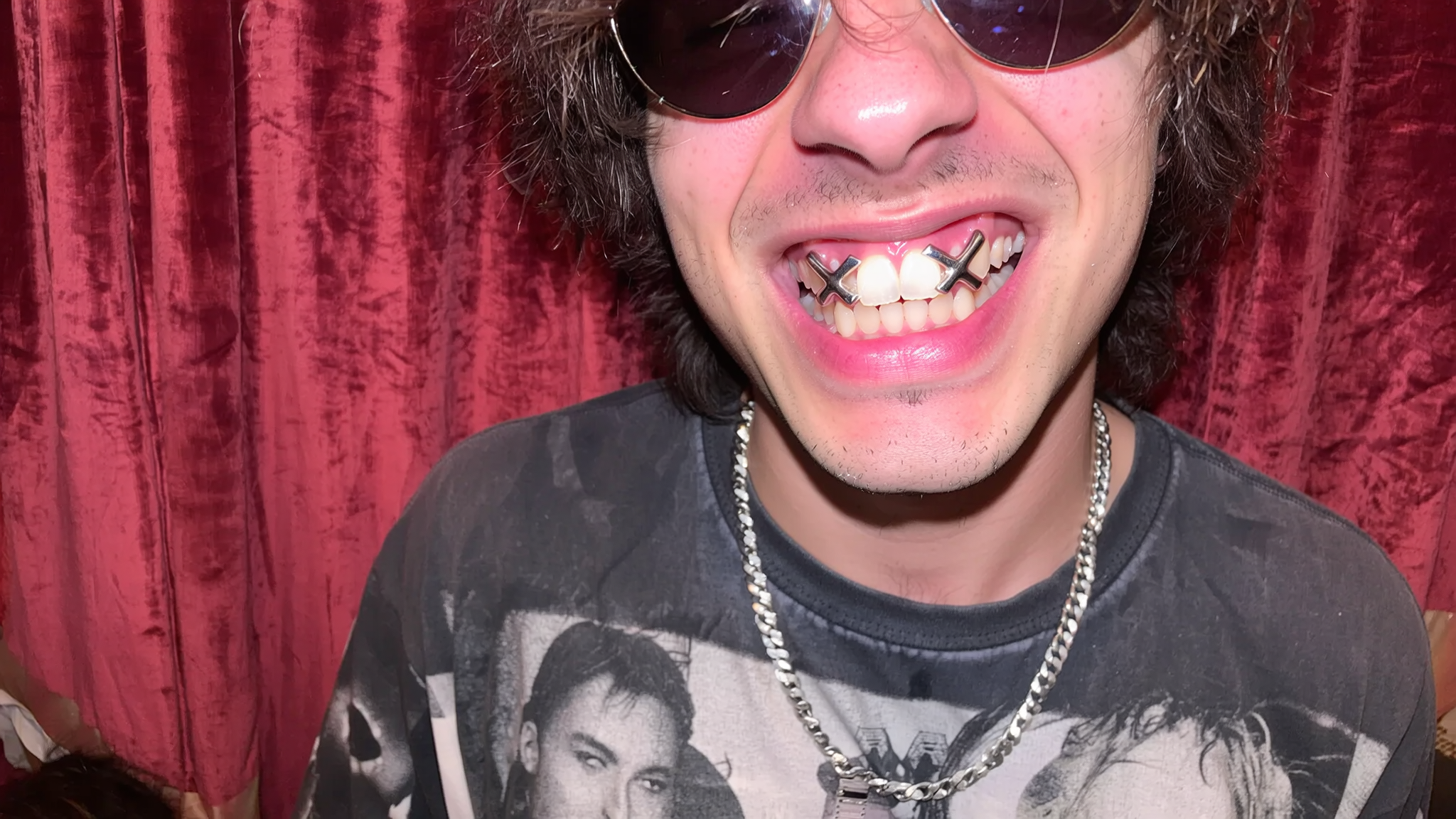 A close-up upper-body shot of a young man grinning widely, on his teeth visible a bold silver grill shaped like an “X” fitted onto a single incisor, the reflective metallic surface catching the flash's intense light and revealing fine texture and subtle shadows that define the unique design. His messy, tousled dark hair contrasts with sleek retro sunglasses perched on his nose, while a thick silver chain necklace peeks over a vintage-style graphic tee in muted black and white tones. The flash casts harsh but authentic light, highlighting natural skin textures and fabric grain, and creating strong, spontaneous shadows reminiscent of an early 2000s pop-punk photobooth vibe. Behind him, a rich red velvet curtain is softly textured yet slightly out of focus, with the whole frame captured at a casual, slightly tilted angle that emphasizes candid, spontaneous energy typical of an iPhone flash selfie.