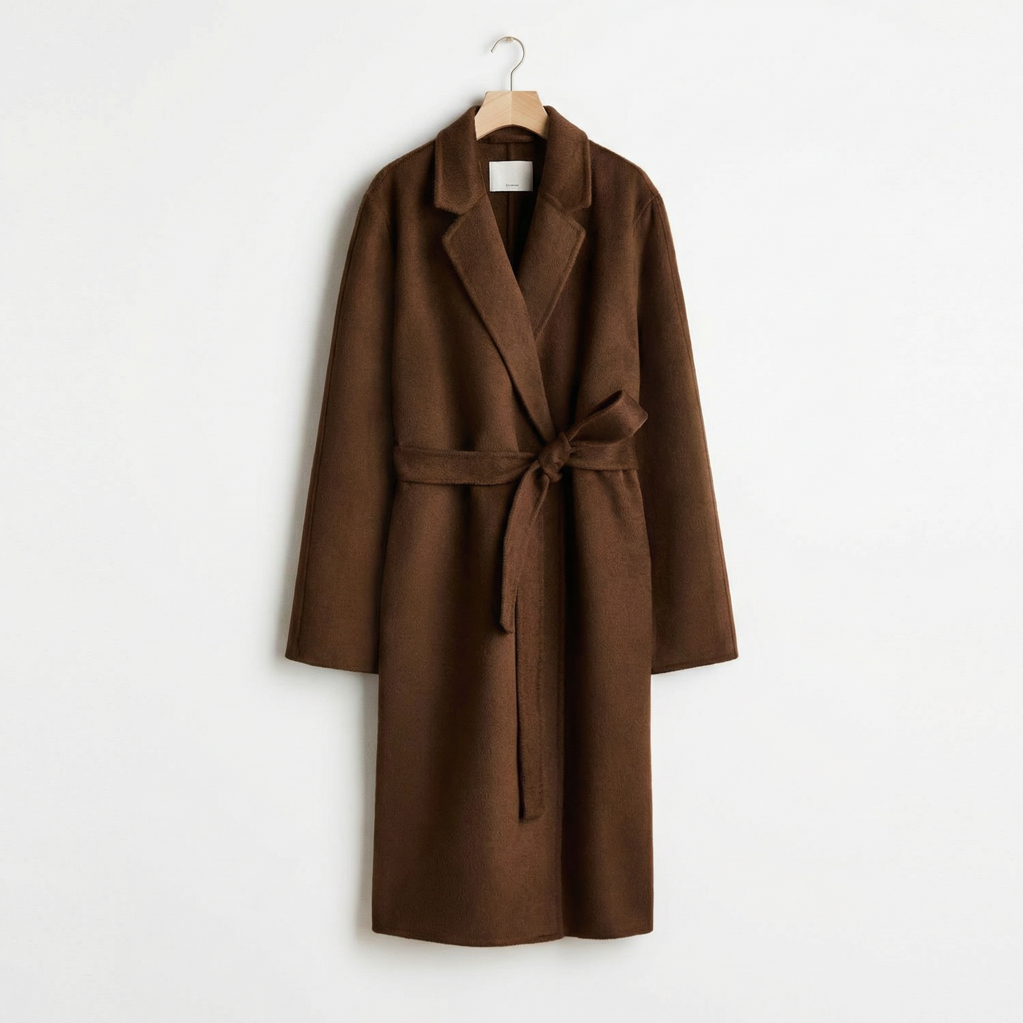 Render the garment hanging on a clean, simple hanger against a white background with even studio lighting. Steps - Inspect the garment silhouette and drape. - Generate the hanger shot using the reference image. Guidelines - Use the reference image when generating the image; preserve the garment exactly. - No logos on the hanger; no extra props.