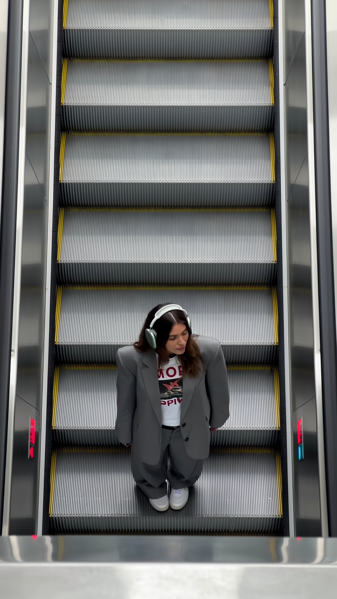 The woman is centered in the frame, wearing a grey oversized suit featuring wide-leg trousers paired with crisp white sneakers. Underneath, she sports a bold printed tee that injects a vibrant contrast into the neutral suit, while chunky headphones add a casual, contemporary Gen Z edge. Her posture is relaxed yet poised, facing slightly to the side in an unposed manner as ambient soft indoor lighting gently enhances the tactile textures of the suit fabric, knitwear, and smooth sneaker surfaces. This image melds business-inspired tailoring with streetwear influences, delivering a fashion-forward, spontaneous escalator fit check with an editorial feel typical of trendy TikTok content.