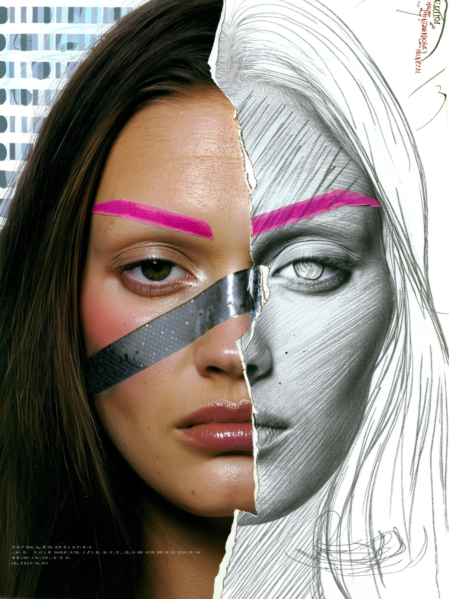 Her face is vertically divided: on one side, sharply stacked eyes run above each other with the top eye rotated slightly; the other side shows natural skin but warped through an overlapping jagged paper seam. Pink eyebrows are duplicated and staggered, some edges torn as if ripped from different source images. Glitter tape slices diagonally across her cheek, physically layered over the graphite drawing side, mixing textures and styles. The sharp cheekbones shift between drawn lines and real skin contours, creating a fractured visual rhythm with crisp, analog collage seams.