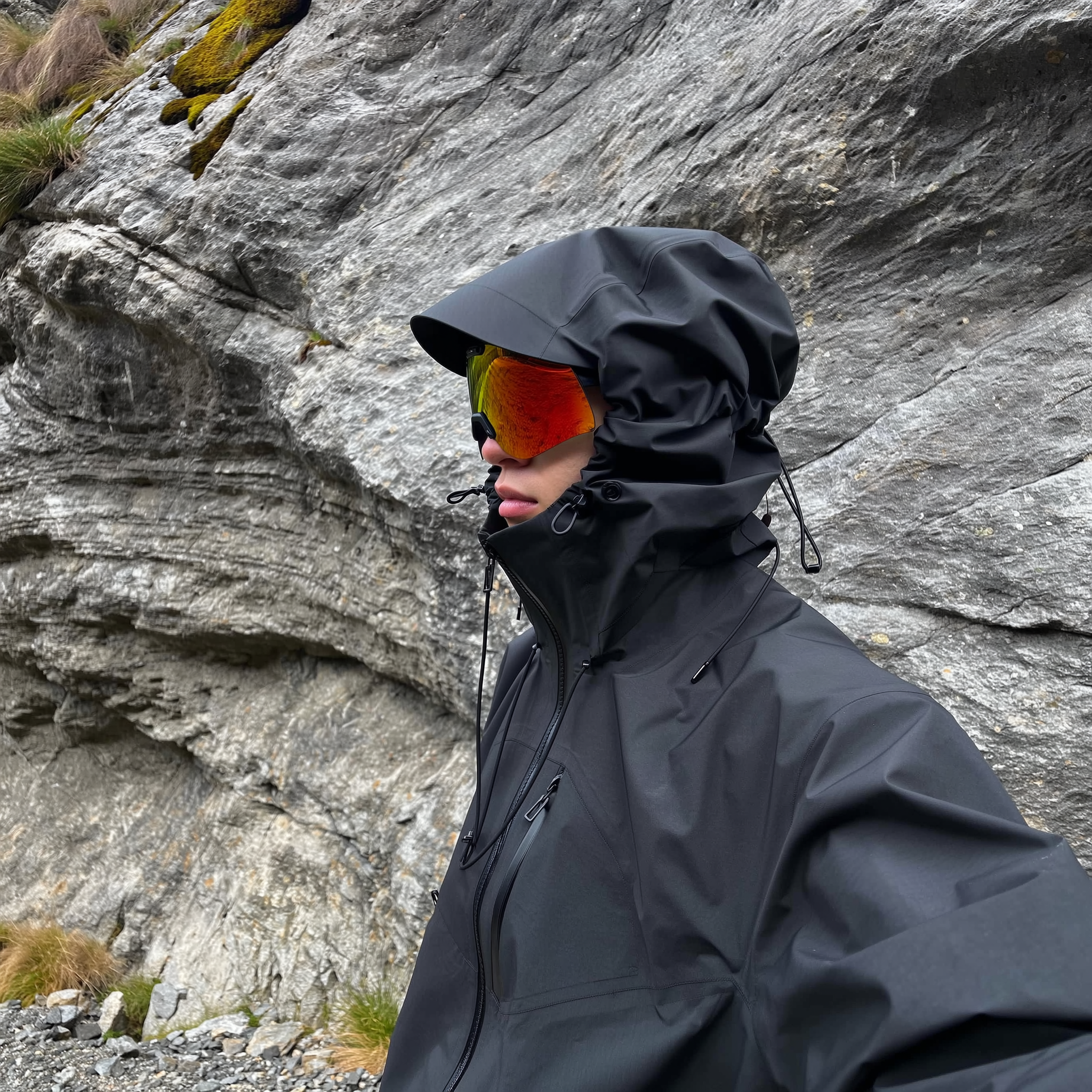 A naturally posed side profile of an individual standing relaxed in front of a textured rugged rock wall within a mountainous terrain. The person wears a matte black technical waterproof hardshell jacket with an oversized hood fully raised, featuring angular shaping and cinch cords creating a sculptural, structured form that closely envelops the head. The jacket shows taped seams and waterproof zippers, highlighting its high-performance, utilitarian design. The individual sports high-contrast, orange-tinted wraparound goggles that vividly reflect the surrounding natural alpine landscape, partially obscuring the face so only the nose and part of the lips are visible beneath the hood and eyewear. Soft, diffused, indirect daylight gently illuminates the scene, emphasizing the rich textures of the waterproof fabric and the coarse rocky surfaces behind. The casual, spontaneous framing includes a subtle, slightly tilted angle, reinforcing the authentic candid iPhone photography aesthetic. This hyper-realistic, cinematic image conveys a calm, tactical, futuristic outdoor vibe within a rugged mountain setting, seamlessly blending minimalist mountain utility with cyberhiker fashion.