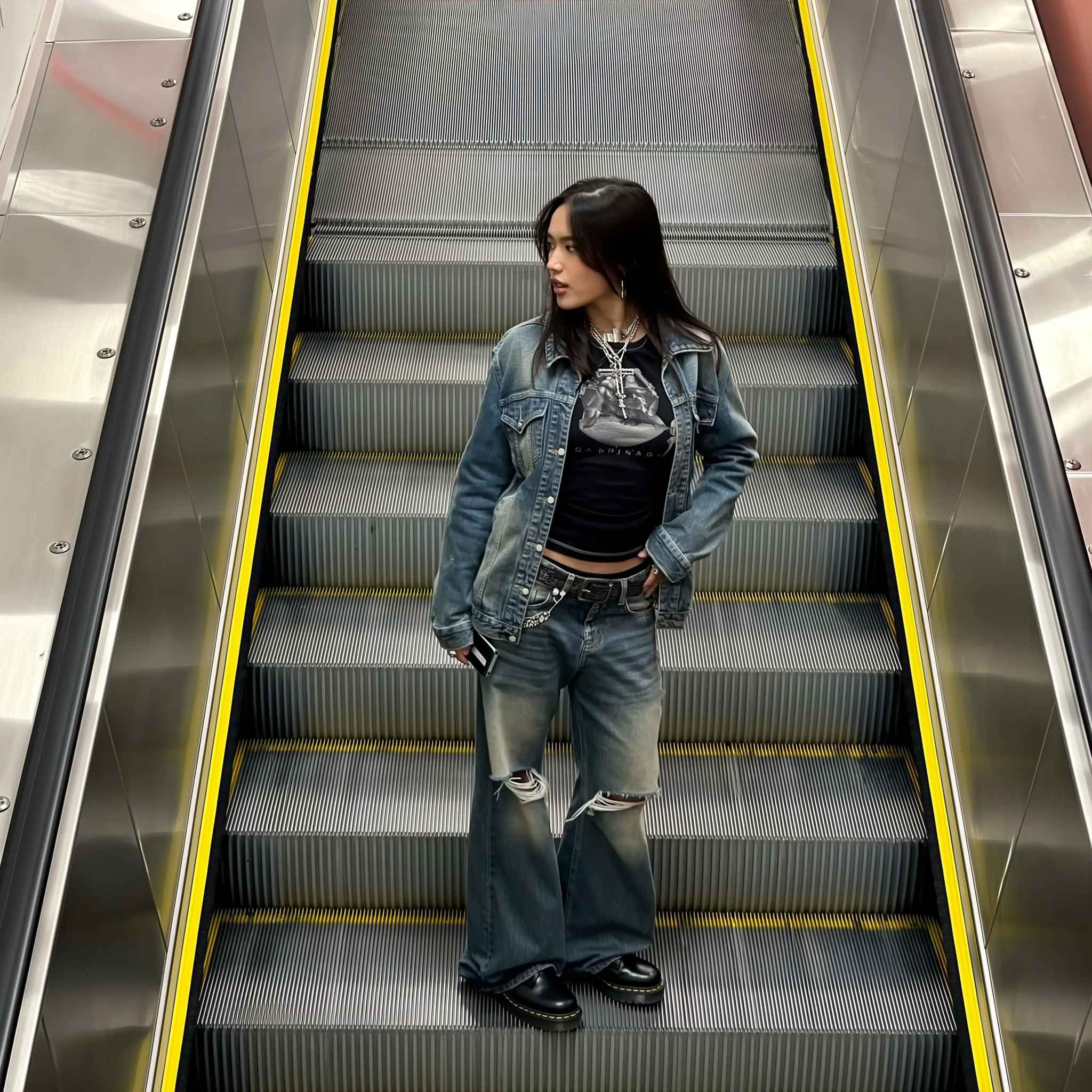 The woman wears a fitted graphic tee layered beneath a distressed denim jacket paired with vintage-inspired flare pants. Her chunky black Doc Martens and layered silver jewelry introduce a bold, edgy undertone to the ensemble. Her gaze is casually directed to the side, adding a spontaneous, candid vibe. Soft, ambient indoor lighting gently illuminates the scene, enhancing the rich textures of denim, leather, and metal while reinforcing an editorial, fashion-forward aesthetic typical of elevated TikTok and Instagram escalator fit-check photography.