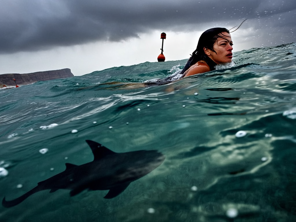 Beneath a tempestuous, slate-gray sky, a solitary swimmer cuts through frothy, restless ocean water, her taut expression framed by wet strands of dark hair clinging to sun-kissed skin. Chiaroscuro light cascades through restless waves, casting fractured patterns that shimmer ominously on her sleek wetsuit. Far below, an indistinct shadow pulses with lurking menace, silhouettes of jagged dorsal fins slicing the deep teal abyss. Gloved hands break the water’s surface in a frozen gesture of caution, lips pressed tight against rising salt spray. Salt-crusted buoys and distant, battered coastal cliffs form a desolate backdrop, the wind whispering secrets of unseen terrors. The camera’s low, sweeping angle captures the perilous intimacy of the moment, textures of saltflakes and slick water droplets sharpening the tension with hyperreal clarity. Muted cobalt and steel tones envelop the frame, deepening the chill and amplifying the primal silence before the storm breaks. —intimate contemporary cinema