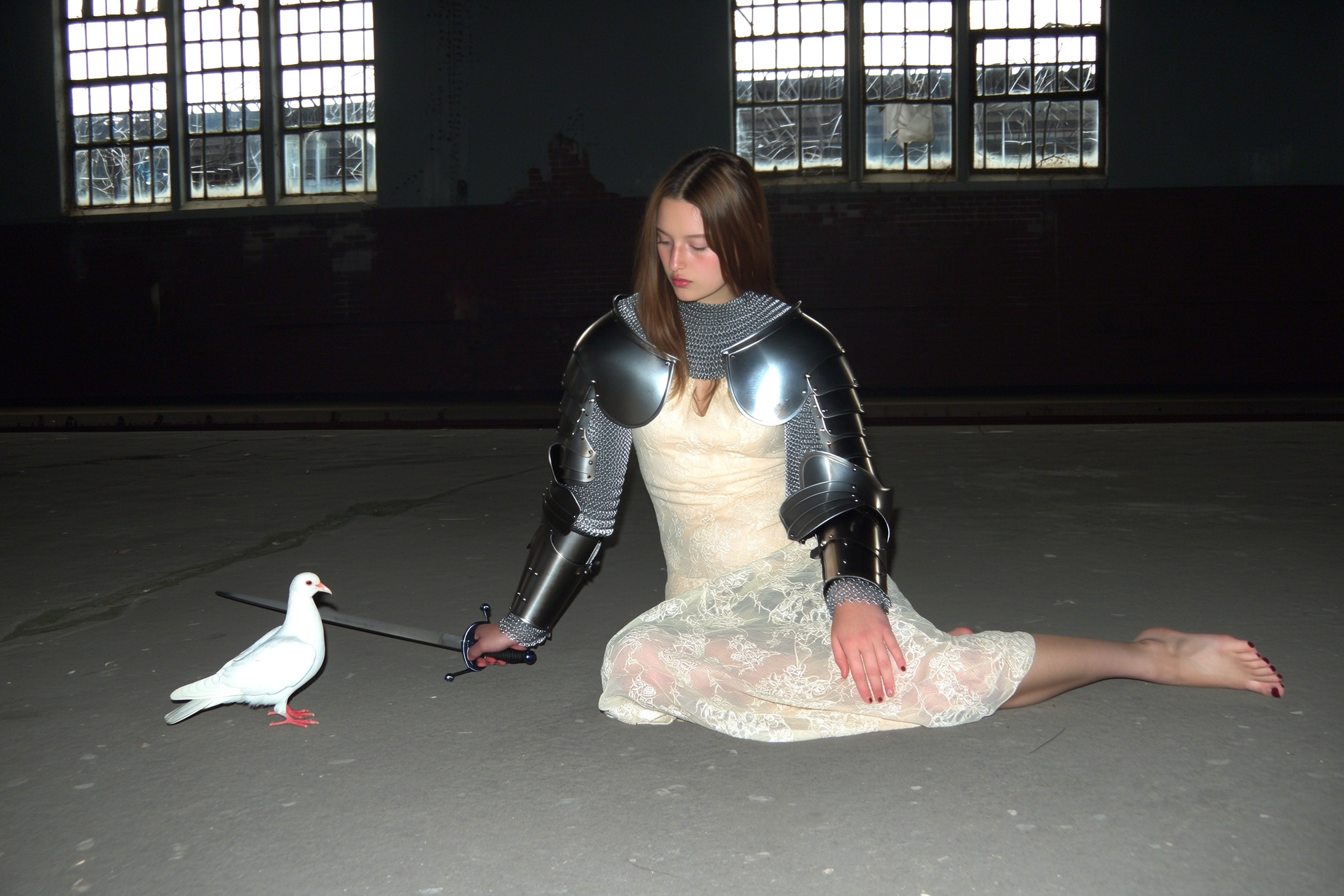 A wide, full-body, eye-level shot from an early 2000s-style digital camera explicitly capturing a young woman sitting gracefully on the floor of a long-abandoned train station with cracked windows. She wears minimal medieval armor consisting of shining shoulder guards and chainmail sleeves paired elegantly with a vintage lace dress, barefoot. Her calm, composed expression looks thoughtfully downward, sword resting elegantly by her side on the floor. A white dove stands quietly beside her, adding to the scene's contemplative mood. Dim, muted, natural light pours through the cracked windows mixing with harsh direct flash, emphasizing the textures of shiny metal armor, delicate lace fabric, bare skin, and individual hair strands. Slight digital noise and over-sharpening accentuate a gritty yet refined atmosphere. The full-body wide shot and informal but balanced framing capture the solemn medieval-core elegance, blending the dark, moody atmosphere of the abandoned interior with refined knightly poise characteristic of early 2000s digital photography.