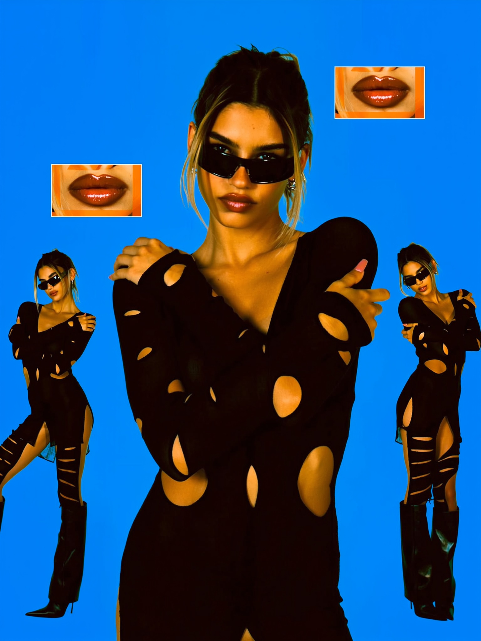 This image features a young woman posing against a solid blue background. She is wearing a black, long-sleeve top with multiple intentional cut-out holes, giving it a distressed look, and dark sunglasses. There are three versions of the woman in the frame: a large close-up in the center with her arms crossed over her chest, and two smaller, full-body versions flanking her on each side in similar poses. Two inset close-up images highlight her glossy lips and eyes, framed with a thin orange rectangle. The photo has a vintage, slightly grainy texture that evokes a retro aesthetic, with the camera angle primarily being a close-up to medium shot at eye level. The composition uses layering and repetition of the subject to create a stylized, artistic effect, with strong color contrast between the black outfit and the bright blue background.
