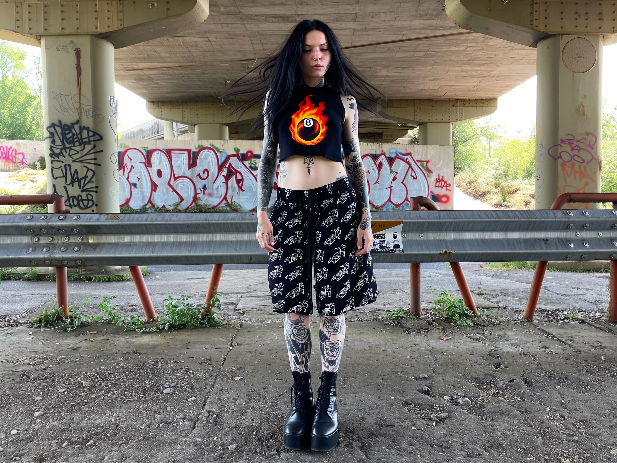 A heavily tattooed young woman stands confidently under an industrial overpass, framed by rough concrete pillars and rusty metal railings, captured in a full-body shot from head to toe. Her long black hair flows loosely, slightly tousled. She wears a cropped black sleeveless top featuring a bold, flaming 8-ball graphic, paired with loose black drawstring shorts adorned with a sharp punk-inspired logo print. Her pale skin is textured and natural, tattoos of skulls, roses, and gothic designs vividly covering her arms and legs with subtle imperfections visible. Heavy black platform combat boots ground her stance. Soft natural light filters through the overpass, casting diffused shadows over the gritty concrete floor and graffiti-stained walls behind. The mood is raw and rebellious with a strong alternative vibe, captured with the intimate spontaneity of an iPhone snapshot.