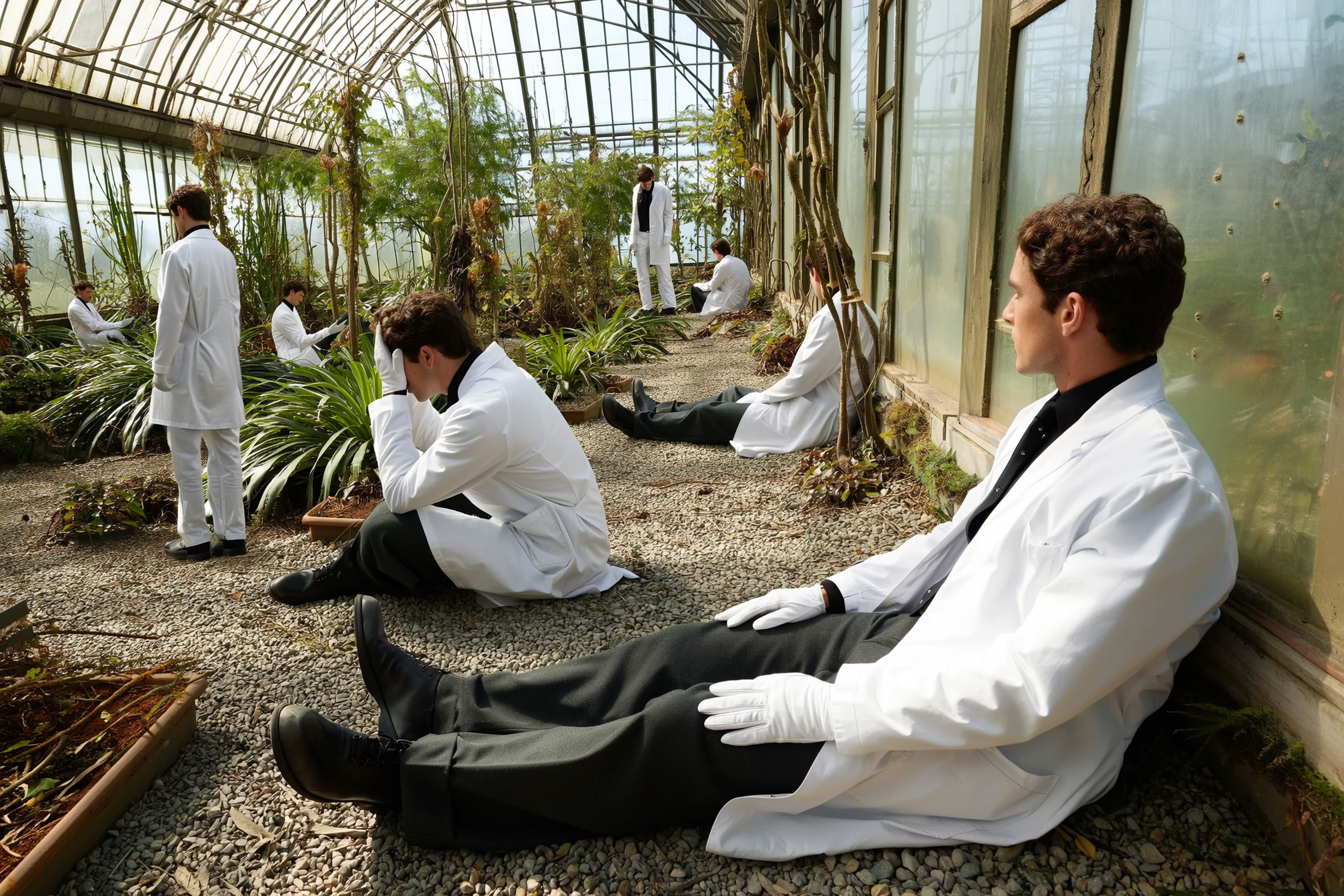 An evocative, surreal iPhone photograph capturing one man duplicated numerous times, always clad in a rigid white coat, dark trousers, and polished gloves, scattered throughout a dry botanical greenhouse filled with overgrown plants. Some instances of him sit casually on gravel pathways, others peer cautiously through dense leaves, while a few press their palms and faces against foggy glass panels, creating an ethereal, haunting fashion echo. Natural sunlight filters softly through the greenhouse, casting believable shadows and highlighting detailed textures of the fabric, skin imperfections, and subtly rough plant surfaces. The composition uses varied scales and unusual perspectives — from close-up partial glances to smaller full-body figures in the background — arranged with intuitive, loosely framed angles reminiscent of spontaneous iPhone captures. The overall scene blends candid authenticity with surreal duplication, producing a contemplative, atmospheric interaction among the repeated figures in a quietly overgrown space.