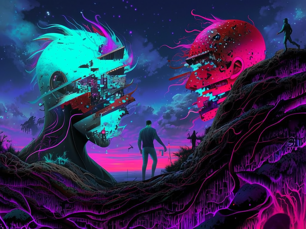 An otherworldly tableau unfolds beneath a twilight sky simmering with saturated electric blues and flickering neon magentas, where fragmented humanoid silhouettes shimmer with spectral translucency. Jagged pixel-like shards fracture faces into a mosaic of glowing cyan and molten crimson, their edges dissolving into swirling veils of analog static and textured grain, suggestive of fading memories caught in digital decay. Organic, curving forms weave seamlessly through sharp geometric fractures, creating a tension-filled interplay of solidity and fluidity, while ghostly driftwood-like veins pulse beneath surfaces, radiating faint violet luminescence. The background ripples with layered, misty gradients and glitch-like flickers, blurring spatial boundaries to evoke a suspended mental landscape fraught with introspective turmoil and fragile identity. This visual symphony melds glitch aesthetics with painterly brushstrokes, balancing vibrant neon chaos against muted analog textures to evoke a haunting fusion of ephemeral presence and tactile decay—digital fluid surrealism.
