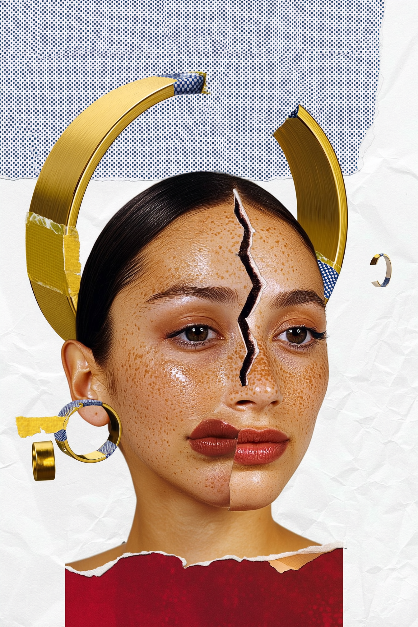 Her face is surrealistically deconstructed: one almond eye is duplicated and rotated downward near her cheek, while the other floats slightly offset above her high forehead, creating vertical dissonance. The forehead is split by a jagged tear, layered with fragments of duplicated skin patches showing varied freckle densities. The lips are repeated twice, one serrated and stretched along her jawline, the other pinched and overlapped near the chin. A massive, circular gold earring—rendered as a torn paper collage ring—hovers above her head, its edges rough with visible cut tape. The other ear shows the same earring in smaller scale, taped crudely onto the face collage, disrupting traditional scale and perspective.