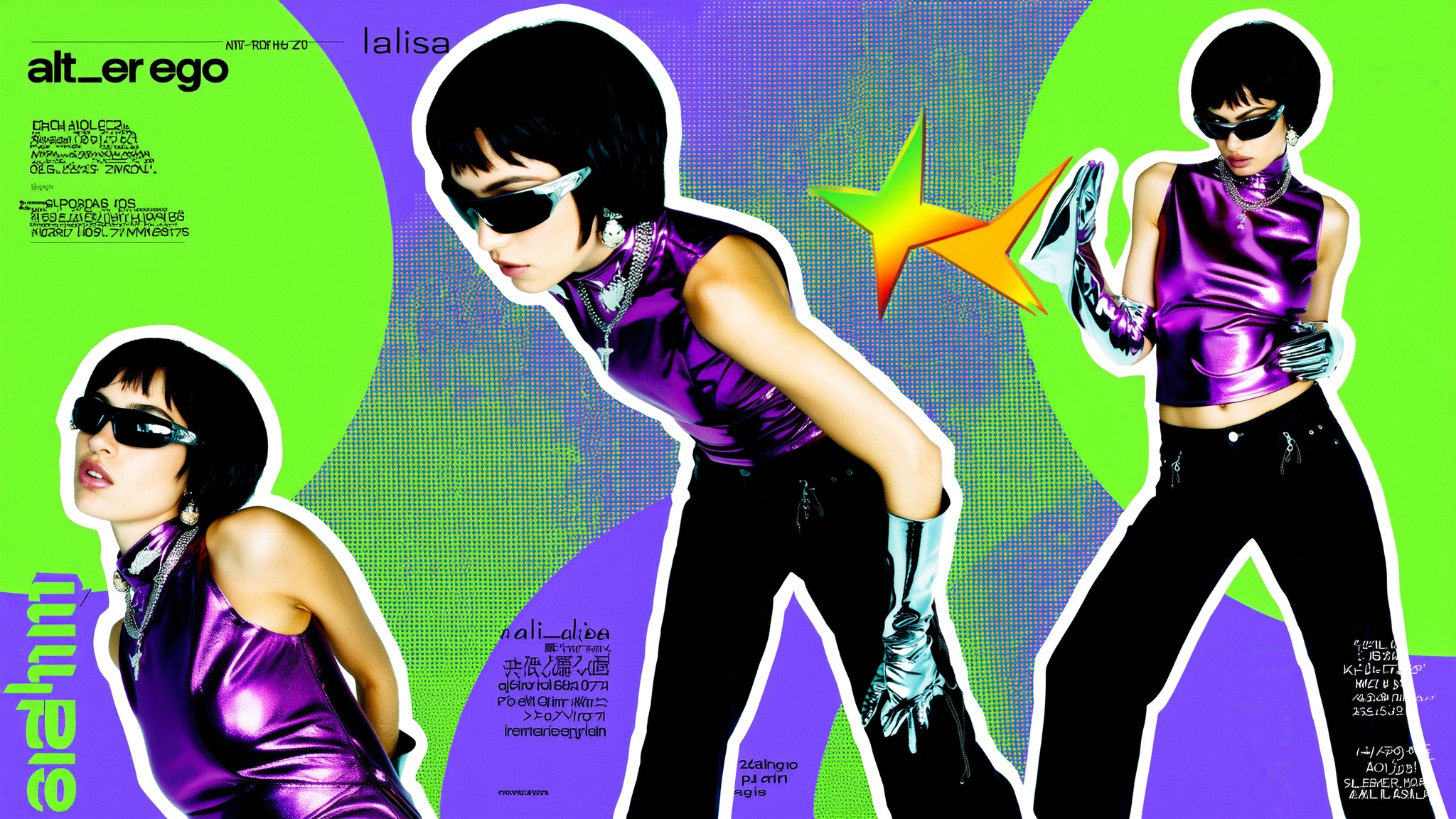 This image is a vibrant, magazine-style collage featuring a female subject named Lalisa. The background uses bold colors with a green and purple gradient and dots pattern, creating a dynamic and retro pop-art effect. The woman is shown in multiple poses wearing a shiny, metallic purple sleeveless top paired with black pants and accessorized with futuristic silver gloves and sunglasses. The subject has a short black haircut and various jewelry pieces, adding a stylish and edgy vibe. Text elements around the image include "alt_er ego," "lalisa," and promotional notes, enhancing the magazine aesthetic. The photo has a grainy, high-contrast digital look with sharp focus, presented in close-up and mid-range shots with varied framing angles such as eye level and slight Dutch tilt. Artistic techniques include strong contrast, vibrant color blocking, and a collage format conveying energy and fashion-forward style.
